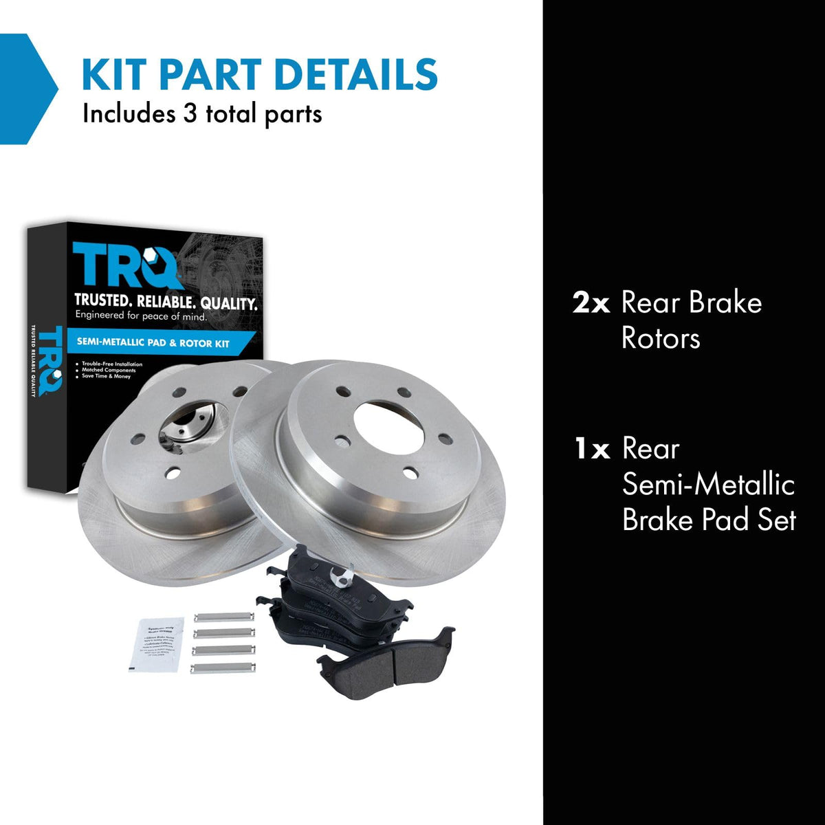 Semi-Metallic Brake Pad & Rotor KitKit Includes(1) Rear Semi-Metallic Brake Pad Set(2) Rear Brake RotorsFitmentCompatible with: 1996-02 Mercury Grand Marquis Rear with Rear Steel Piston Calipers with 1-3/4 Inch Pad ClipCompatible with: 1996-02 Lincoln Town Car Rear with Rear Steel Piston Calipers with 1-3/4 Inch Pad ClipCompatible with: 1996-02 Ford Crown Victoria Rear with Rear Steel Piston Calipers with 1-3/4 Inch Pad ClipProduct AttributesRear Brake Rotor Diameter: 11.22 in. (285mm)Wheel Lug Count: 5 LugBrake Pad Bonding Type: Premium PosiBrake Pad Friction Material: Semi-MetallicRear Brake Rotor Venting Type: SolidProduct Features Positive Molded - Less dust resulting in clean wheels G3000 Casting Alloy - Reduced noise and improved wear resistance Application Specific Design - Extended service life, no modificationsItem DetailsTRQ brake kits are designed to restore your brake system to like-new performance. TRQ brake pads are positive molded, thermal scorched, chamfered, and utilize a multi-layer shim for enhanced performance and service life. TRQ rotors have a non-directional finish that reduces the break-in period for new rotors as well as reducing vibrations throughout the rotors lifecycle. All products are fit and road-tested in our Massachusetts R&D facility to ensure we deliver on our promise of Trusted Reliable Quality.Reference NumbersAimco: 54027Bendix: PRT5109DuraGo: BR54027Ford: F6AZ2200BA, F6AZ2200CA, F8AZ2200AAHollander: 533-02327Lincoln: 2W1Z2200AAMercury: F6AZ2200BA, F6AZ2200CA, F8AZ2200AARaybestos Brakes: 66595, 66595FZN, 66595P, 66595R, EHT674H, MGD674MH, SGD674M, SP674PPHWagner: BD125481