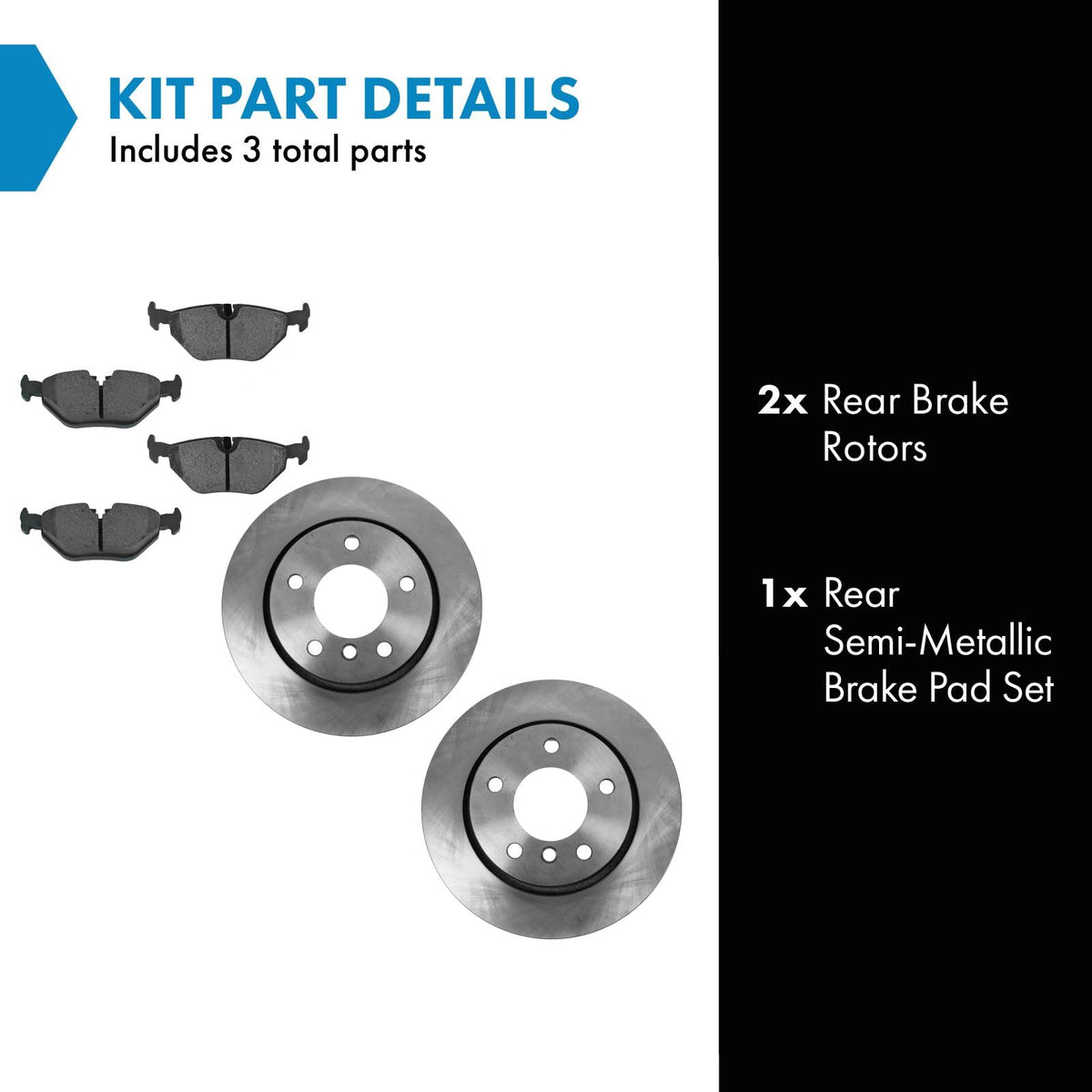 Semi-Metallic Brake Pad & Rotor KitKit Includes(1) Rear Semi-Metallic Brake Pad Set(2) Rear Brake RotorsFitmentCompatible with: 2000 BMW 323i Wagon RearCompatible with: 1999-00 BMW 328i RearCompatible with: 2000 BMW 323Ci Convertible RearCompatible with: 2000 BMW 328Ci RearProduct AttributesRear Brake Rotor Diameter: 11.57 in. (294mm)Wheel Lug Count: 5 LugBrake Pad Bonding Type: Premium PosiBrake Pad Friction Material: Semi-MetallicRear Brake Rotor Venting Type: SolidProduct Features Positive Molded - Less dust resulting in clean wheels G3000 Casting Alloy - Reduced noise and improved wear resistance Application Specific Design - Extended service life, no modificationsItem DetailsTRQ brake kits are designed to restore your brake system to like-new performance. TRQ brake pads are positive molded, thermal scorched, chamfered, and utilize a multi-layer shim for enhanced performance and service life. TRQ rotors have a non-directional finish that reduces the break-in period for new rotors as well as reducing vibrations throughout the rotors lifecycle. All products are fit and road-tested in our Massachusetts R&D facility to ensure we deliver on our promise of Trusted Reliable Quality.Reference NumbersAimco: 34220Bendix: PRT5417BMW: 34211157334, 34211157814, 34211158221, 34211160198, 34211160199, 34211160533, 34211162536, 34212226092DIY Solutions: BFS00682, BFS01357DuraGo: BR34220Hollander: 533-58560Raybestos Brakes: 980127, 980127FZN, 980127P, 980127R, PGD396MWagner: BD126247