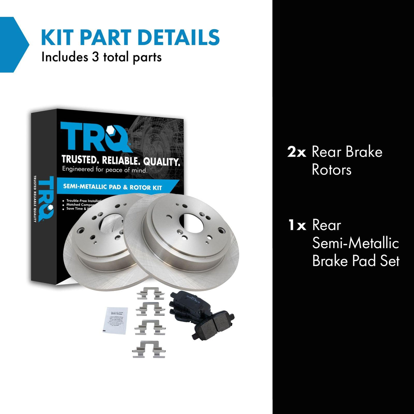 Semi-Metallic Brake Pad & Rotor KitKit Includes(1) Rear Semi-Metallic Brake Pad Set(2) Rear Brake RotorsFitmentCompatible with: 2003-08 Honda Pilot RearCompatible with: 2001-06 Acura MDX RearProduct AttributesBrake Pad Bonding Type: Premium PosiBrake Pad Friction Material: Semi-MetallicProduct Features Positive Molded - Less dust resulting in clean wheels G3000 Casting Alloy - Reduced noise and improved wear resistance Application Specific Design - Extended service life, no modificationsItem DetailsTRQ brake kits are designed to restore your brake system to like-new performance. TRQ brake pads are positive molded, thermal scorched, chamfered, and utilize a multi-layer shim for enhanced performance and service life. TRQ rotors have a non-directional finish that reduces the break-in period for new rotors as well as reducing vibrations throughout the rotors lifecycle. All products are fit and road-tested in our Massachusetts R&D facility to ensure we deliver on our promise of Trusted Reliable Quality.Reference NumbersAcura: 43022S3VA01, 43022S3VA10, 43022S3VA11Aimco: 31318Bendix: PRT5393DuraGo: BR31318Honda: 43022S0XA00, 43022S3VA01, 43022S3VA02Raybestos Brakes: 980032, 980032FZN, 980032P, 980032PER, 980032R, EHT865HWagner: BD126051