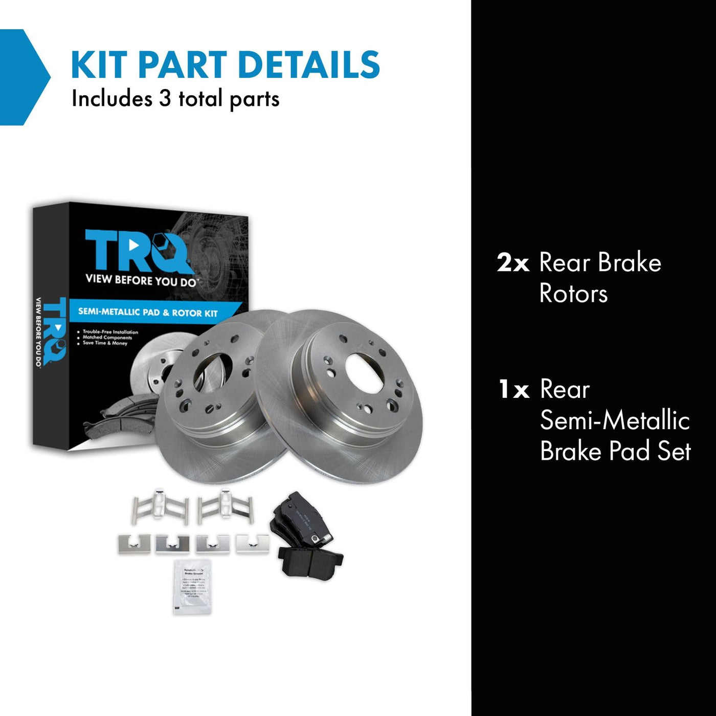 Semi-Metallic Brake Pad & Rotor KitKit Includes(1) Rear Semi-Metallic Brake Pad Set(2) Rear Brake RotorsFitmentCompatible with: 2002-04 Honda CR-V RearProduct AttributesBrake Pad Bonding Type: Premium PosiBrake Pad Friction Material: Semi-MetallicProduct Features Positive Molded - Less dust resulting in clean wheels G3000 Casting Alloy - Reduced noise and improved wear resistance Application Specific Design - Extended service life, no modificationsItem DetailsTRQ brake kits are designed to restore your brake system to like-new performance. TRQ brake pads are positive molded, thermal scorched, chamfered, and utilize a multi-layer shim for enhanced performance and service life. TRQ rotors have a non-directional finish that reduces the break-in period for new rotors as well as reducing vibrations throughout the rotors lifecycle. All products are fit and road-tested in our Massachusetts R&D facility to ensure we deliver on our promise of Trusted Reliable Quality.Reference NumbersAcura: 43022SEPA00, 43022SEPC01, 43022SP0000, 43022SP0010, 43022SP0020, 43022SP0030, 43022STKA01, 43022SV4G00, 43022SX0A50, 43022SZ3A00, 43022SZ3A01, NBKD6291EFAimco: 31304Bendix: PRT5399DuraGo: BR31304Hollander: 533-58654Honda: 43022S6D000, 43022S9AA00, 43022S9AA01, 43022SCVA00, 43022SV4G00, 43022SX0A50Isuzu: 5862029840, 5862070780, 5862072040Raybestos Brakes: 980071, 980071FZN, 980071P, 980071R, EHT536HWagner: BD126086