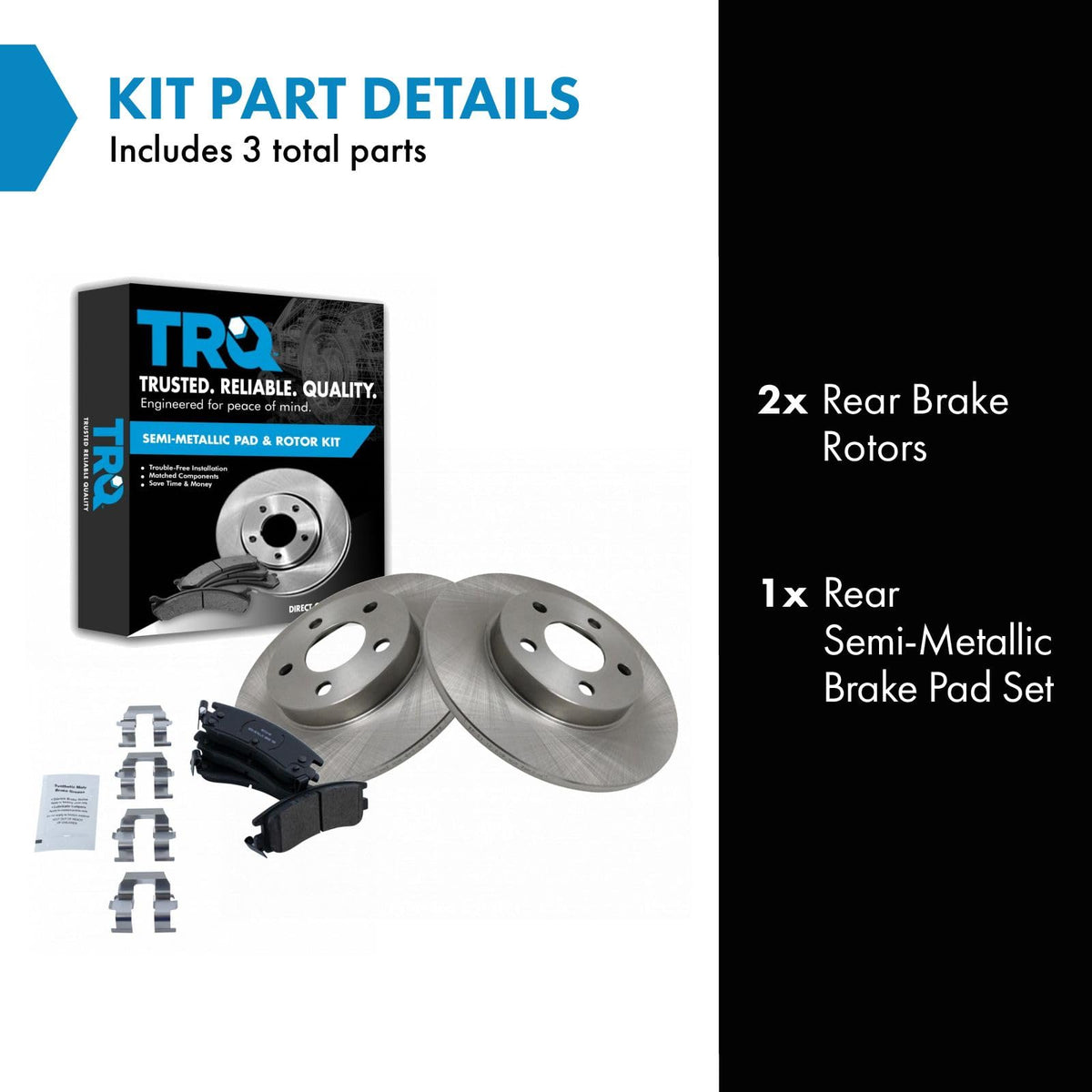 Semi-Metallic Brake Pad & Rotor KitKit Includes(1) Rear Semi-Metallic Brake Pad Set(2) Rear Brake RotorsFitmentCompatible with: 2000-05 Cadillac Deville Rear with 5 Lug WheelsCompatible with: 2003-05 Buick Park Avenue Ultra RearCompatible with: 2004-05 Pontiac Bonneville GXP RearCompatible with: 2003-04 Cadillac Seville Rear with 5 Lug WheelsProduct AttributesBrake Pad Bonding Type: Premium PosiBrake Pad Friction Material: Semi-MetallicProduct Features Positive Molded - Less dust resulting in clean wheels G3000 Casting Alloy - Reduced noise and improved wear resistance Application Specific Design - Extended service life, no modificationsItem DetailsTRQ brake kits are designed to restore your brake system to like-new performance. TRQ brake pads are positive molded, thermal scorched, chamfered, and utilize a multi-layer shim for enhanced performance and service life. TRQ rotors have a non-directional finish that reduces the break-in period for new rotors as well as reducing vibrations throughout the rotors lifecycle. All products are fit and road-tested in our Massachusetts R&D facility to ensure we deliver on our promise of Trusted Reliable Quality.Reference NumbersAimco: 55051Bendix: PRT5220Buick: 18043995, 18043999Cadillac: 18029826, 18043995, 18043999Chevrolet: 18024530, 18043995DuraGo: BR55051Hollander: 533-02375Oldsmobile: 12510045, 18029826, 18043995, 18043999Pontiac: 18043995, 18043999Raybestos Brakes: 56698, 56698FZN, 56698P, 56698R, EHT714HSaturn: 21012052Wagner: BD125562