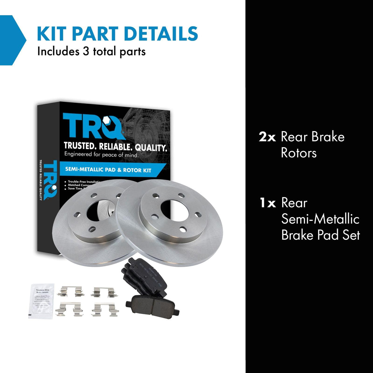 Semi-Metallic Brake Pad & Rotor KitKit Includes(1) Rear Semi-Metallic Brake Pad Set(2) Rear Brake RotorsFitmentCompatible with: 2011-13 Chevrolet Impala RearCompatible with: 2005-09 Buick LaCrosse CX RearCompatible with: 2005-09 Buick LaCrosse CXL RearCompatible with: 2005-08 Pontiac Grand Prix Base Model RearCompatible with: 2005-09 Buick LaCrosse CXS RearCompatible with: 2005-07 Pontiac Grand Prix GT RearCompatible with: 2014-16 Chevrolet Impala Limited RearCompatible with: 2004 Pontiac Grand Prix RearCompatible with: 2005 Pontiac Grand Prix GTP RearCompatible with: 2005-08 Buick Allure RearProduct AttributesRear Brake Rotor Diameter: 10.63 in. (270mm)Wheel Lug Count: 5 LugBrake Pad Bonding Type: Premium PosiBrake Pad Friction Material: Semi-MetallicRear Brake Rotor Venting Type: SolidProduct Features Positive Molded - Less dust resulting in clean wheels G3000 Casting Alloy - Reduced noise and improved wear resistance Application Specific Design - Extended service life, no modificationsItem DetailsTRQ brake kits are designed to restore your brake system to like-new performance. TRQ brake pads are positive molded, thermal scorched, chamfered, and utilize a multi-layer shim for enhanced performance and service life. TRQ rotors have a non-directional finish that reduces the break-in period for new rotors as well as reducing vibrations throughout the rotors lifecycle. All products are fit and road-tested in our Massachusetts R&D facility to ensure we deliver on our promise of Trusted Reliable Quality.Reference NumbersAimco: 55085Bendix: PRT5442Buick: 18048690Chevrolet: 18048690DuraGo: BR55085Pontiac: 18048690Raybestos Brakes: 580171, 580171FZN, 580171P, 580171R, 581033, 581033FZN, 581033P, 581033R, EHT999HWagner: BD126180