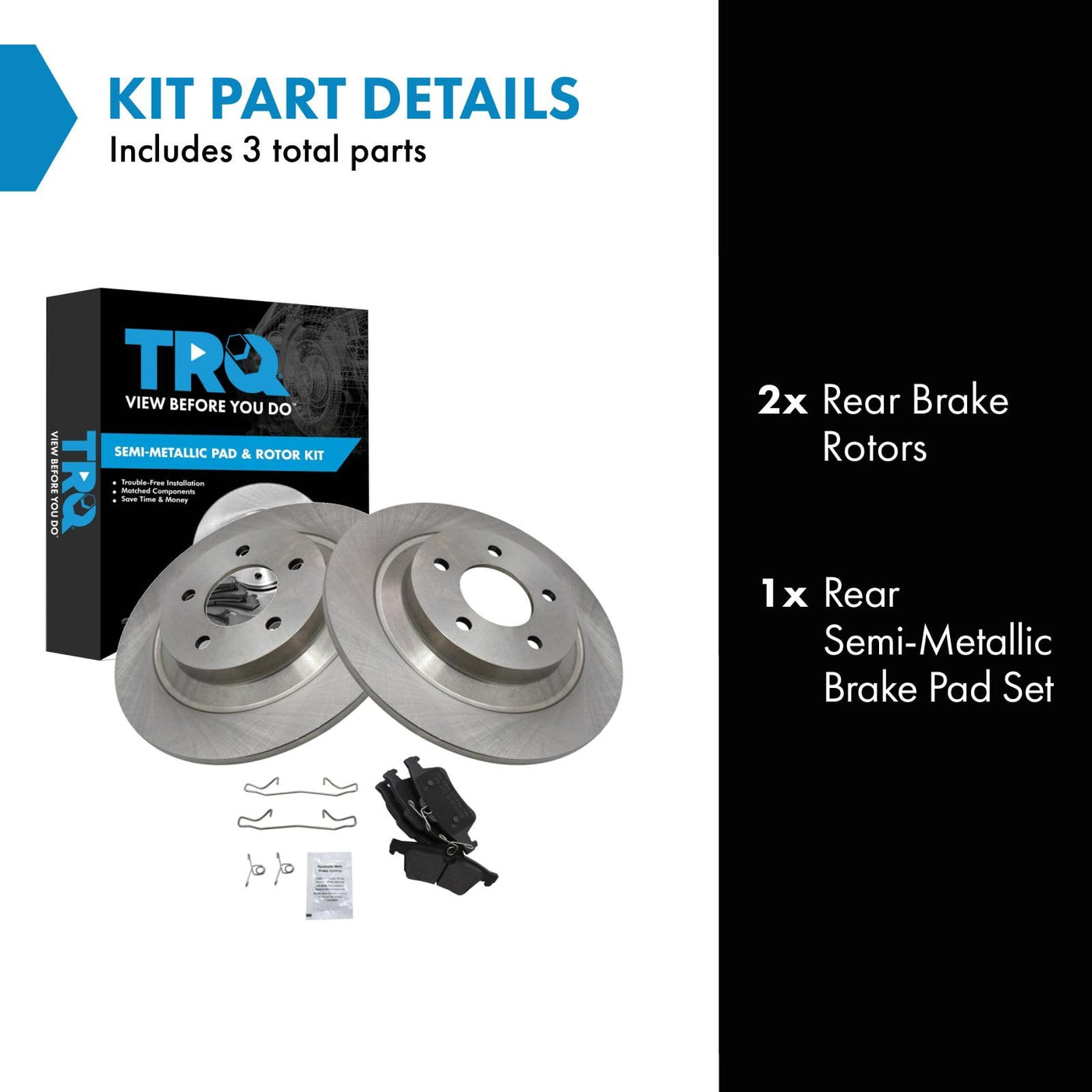 Semi-Metallic Brake Pad & Rotor KitKit Includes(1) Rear Semi-Metallic Brake Pad Set(2) Rear Brake RotorsFitmentCompatible with: 2012-15 Mazda 5 RearCompatible with: 2007-10 Mazda 5 RearProduct AttributesBrake Pad Friction Material: Semi-MetallicProduct Features Positive Molded - Less dust resulting in clean wheels G3000 Casting Alloy - Reduced noise and improved wear resistance Application Specific Design - Extended service life, no modificationsItem DetailsTRQ brake kits are designed to restore your brake system to like-new performance. TRQ brake pads are positive molded, thermal scorched, chamfered, and utilize a multi-layer shim for enhanced performance and service life. TRQ rotors have a non-directional finish that reduces the break-in period for new rotors as well as reducing vibrations throughout the rotors lifecycle. All products are fit and road-tested in our Massachusetts R&D facility to ensure we deliver on our promise of Trusted Reliable Quality.Reference NumbersAimco: 31435Audi: 4B0698151AC, 4B0698151AD, 4B0698151R, 4F0698151A, 8E0698151CBendix: PRT5977Chevrolet: 15271565DuraGo: BR900456Ford: AV6Z2200AHollander: 533-59115Jaguar: C2C27271, C2D23143, C2P17595Mazda: B3YF3323Z, BPYK2648ZB, C2Y32648ZA, C2Y32648ZBPontiac: 15271565Raybestos Brakes: 980472, 980472FZN, 980472P, 980472R, EHT1095HSaab: 93166942, 93183140, 93190338, 93195754Saturn: 15271565Volkswagen: 1K0698151BVolvo: 307420290, 30742031, 307420310, 31212184Wagner: BD126564