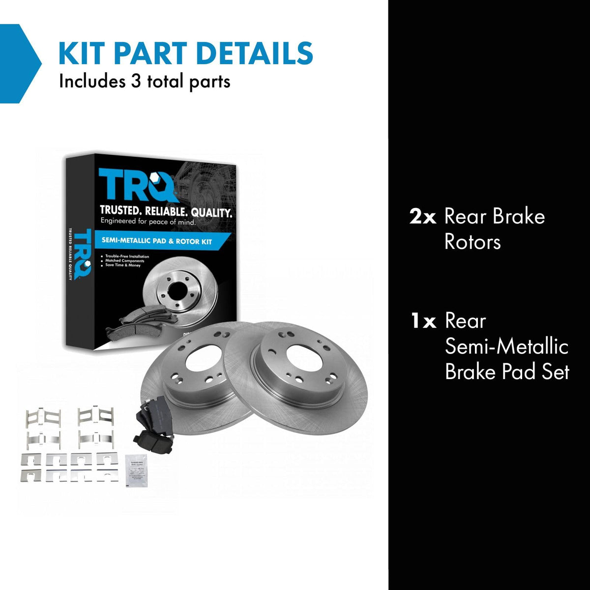 Semi-Metallic Brake Pad & Rotor KitKit Includes(1) Rear Semi-Metallic Brake Pad Set(2) Rear Brake RotorsFitmentCompatible with: 2008-14 Honda Civic EX RearCompatible with: 2008-14 Honda Civic SI RearCompatible with: 2006-07 Honda Civic Rear with Rear Disc BrakesCompatible with: 2015 Honda Civic SI Sedan RearCompatible with: 2015 Honda Civic EX Coupe RearCompatible with: 2015 Honda Civic SI Coupe RearCompatible with: 2013-15 Acura ILX RearProduct AttributesRear Brake Rotor Diameter: 10.24 in. (260mm)Wheel Lug Count: 5 LugBrake Pad Bonding Type: Premium PosiBrake Pad Friction Material: Semi-MetallicRear Brake Rotor Venting Type: SolidProduct Features Positive Molded - Less dust resulting in clean wheels G3000 Casting Alloy - Reduced noise and improved wear resistance Application Specific Design - Extended service life, no modificationsItem DetailsTRQ brake kits are designed to restore your brake system to like-new performance. TRQ brake pads are positive molded, thermal scorched, chamfered, and utilize a multi-layer shim for enhanced performance and service life. TRQ rotors have a non-directional finish that reduces the break-in period for new rotors as well as reducing vibrations throughout the rotors lifecycle. All products are fit and road-tested in our Massachusetts R&D facility to ensure we deliver on our promise of Trusted Reliable Quality.Reference NumbersAcura: 43022S5AJ00, 43022S84A50, 43022SL5000, 43022SV4A20, 43022SV4G22, 43022SY8A00, 43022SY8A01, 43022TR0A00, 43022TR0A01Aimco: 31420Bendix: PRT5765DuraGo: BR900648Hollander: 533-50108Honda: 43022S2A000, 43022S5AJ00, 43022S6D010, 43022S6DE50, 43022S84A50, 43022SL5000, 43022SM4G00, 43022SV4A00, 43022SV4A20, 43022SV4A21, 43022SV4A22, 43022SV4A23, 43022SV4G20, 43022SV4G21, 43022SV4G22, 43022SY8A00, 43022SY8A01, 43022TR0A00, 43022TR0A01Raybestos Brakes: 980402, 980402FZN, 980402P, 980402R, EHT537HSuzuki: 43022SM4G00, 55800-57L52, 5580057L00, 5580057L50, 5580080J00, 5580080J01, 5580080J02