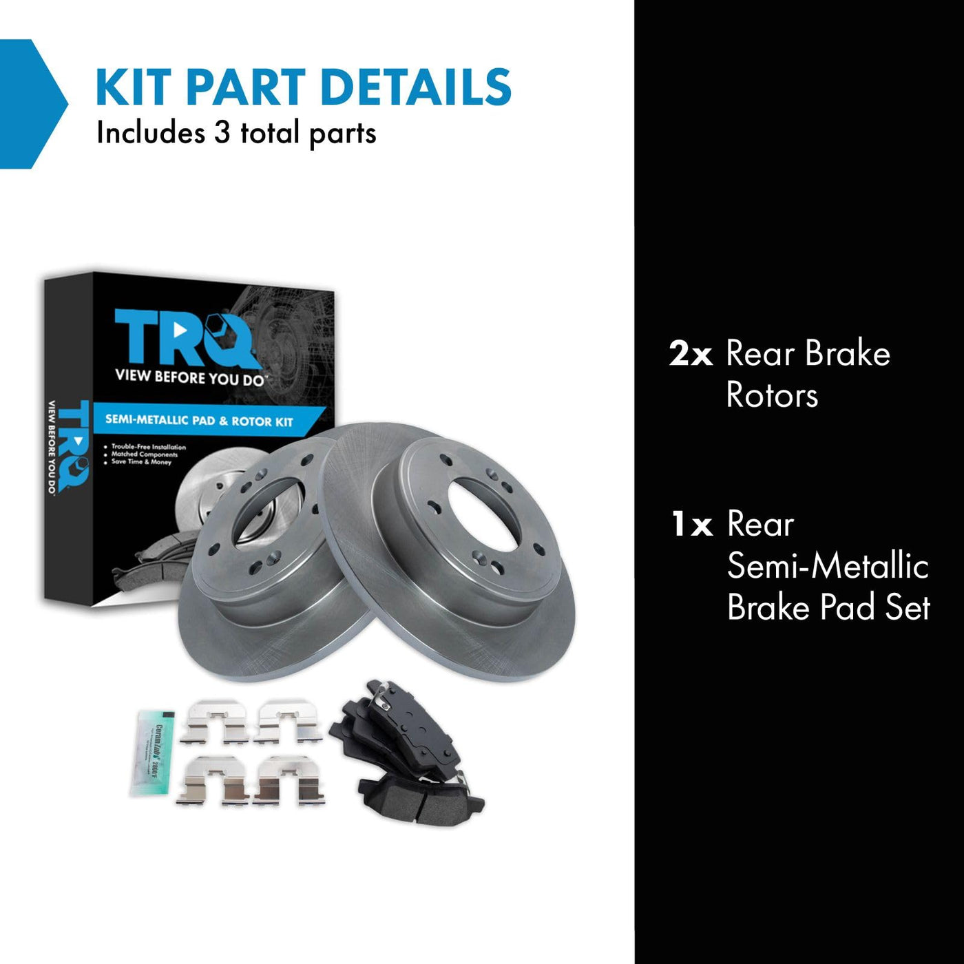 Semi-Metallic Brake Pad & Rotor KitKit Includes(1) Rear Semi-Metallic Brake Pad Set(2) Rear Brake RotorsFitmentCompatible with: 2014-16 Kia Soul RearCompatible with: 2014-18 Kia Forte RearCompatible with: 2012-15 Hyundai Veloster RearCompatible with: 2013-16 Hyundai Elantra GT RearCompatible with: 2014-18 Kia Forte5 RearCompatible with: 2014-16 Kia Forte Koup RearProduct AttributesBrake Pad Bonding Type: Premium PosiBrake Pad Friction Material: Semi-MetallicProduct Features Positive Molded - Less dust resulting in clean wheels G3000 Casting Alloy - Reduced noise and improved wear resistance Application Specific Design - Extended service life, no modificationsItem DetailsTRQ brake kits are designed to restore your brake system to like-new performance. TRQ brake pads are positive molded, thermal scorched, chamfered, and utilize a multi-layer shim for enhanced performance and service life. TRQ rotors have a non-directional finish that reduces the break-in period for new rotors as well as reducing vibrations throughout the rotors lifecycle. All products are fit and road-tested in our Massachusetts R&D facility to ensure we deliver on our promise of Trusted Reliable Quality.Reference NumbersAimco: 31603Bendix: PRT6149DuraGo: BR901100Raybestos Brakes: 980957, 980957FZN, 980957P, 980957RWagner: BD180378
