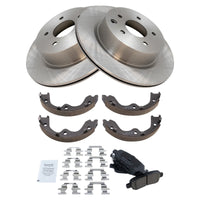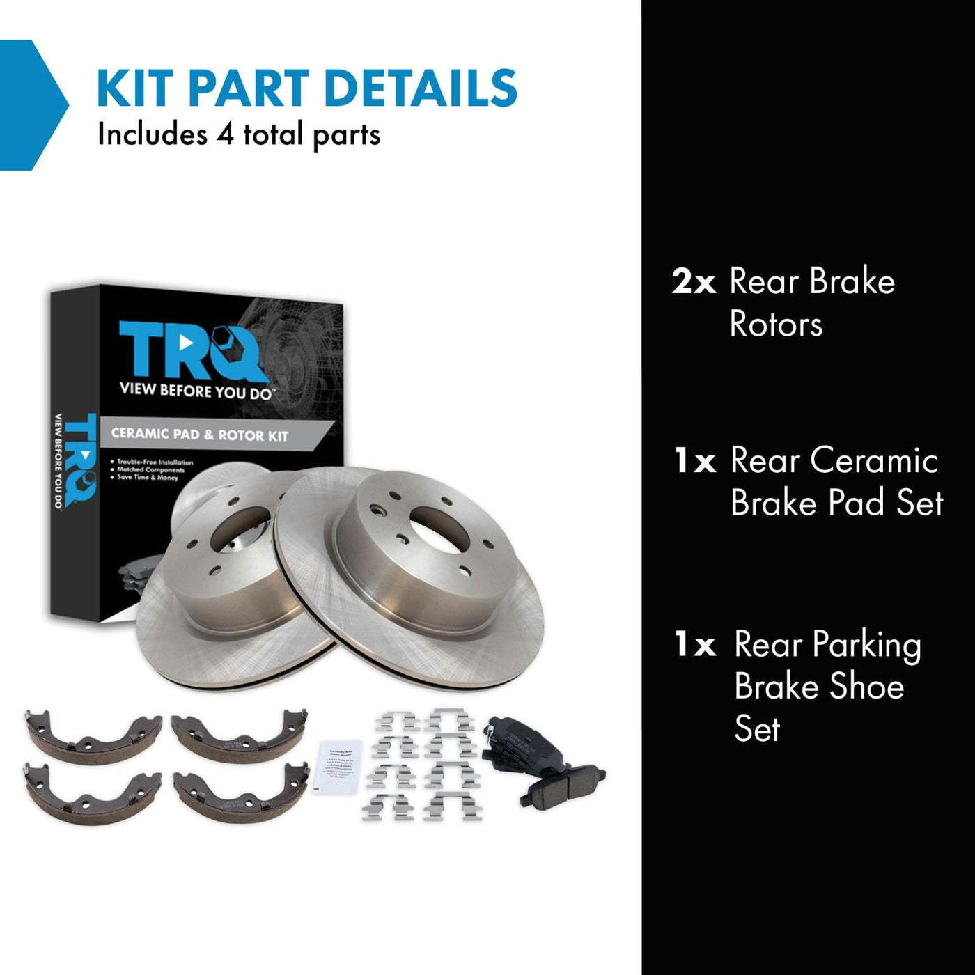 Ceramic Brake Pad & Rotor KitKit Includes(1) Rear Ceramic Brake Pad Set(1) Rear Parking Brake Shoe Set(2) Rear Brake RotorsFitmentCompatible with: 2011-13 Infiniti G37 Sedan Rear without Brembo brakes without Sport Package with Parking ShoesCompatible with: 2009-10 Infiniti G37 Base Model Sedan Rear without Sport Package with Parking ShoesCompatible with: 2009-10 Infiniti G37 Journey Sedan Rear without Sport Package with Parking ShoesCompatible with: 2009-10 Infiniti G37 Sport Sedan Rear without Sport Package with Parking ShoesCompatible with: 2005-06 Infiniti G35 Rear with Parking ShoesCompatible with: 2006-10 Infiniti M35 Rear with Parking ShoesCompatible with: 2014-17 Infiniti QX50 Rear with Parking ShoesCompatible with: 2006-09 Nissan 350Z Touring Rear with Single Piston Rear Calipers with Parking ShoesCompatible with: 2006-08 Nissan 350Z Base Model Rear with Single Piston Rear Calipers with Parking ShoesCompatible with: 2008 Infiniti G35 Rear without Brembo brakes with Parking ShoesCompatible with: 2007 Infiniti G35 V36 Rear without High Capacity Actively Controlled Steering with Parking ShoesCompatible with: 2007 Infiniti G35 V35 Rear with Parking ShoesCompatible with: 2010-14 Nissan 370Z Base Model Rear with Single Piston Rear Calipers without Sport Package with Parking ShoesCompatible with: 2010-14 Nissan 370Z Touring Rear with Single Piston Rear Calipers without Sport Package with Parking ShoesCompatible with: 2008-12 Infiniti EX35 Rear with Parking ShoesCompatible with: 2007-08 Nissan 350Z Enthusiast Rear with Single Piston Rear Calipers without Brembo brakes with Parking ShoesCompatible with: 2006 Nissan 350Z Enthusiast Rear with Single Piston Rear Calipers with Parking ShoesCompatible with: 2005 Nissan 350Z Enthusiast From 8/01/05 Production Date Rear with Single Piston Rear Calipers with Parking ShoesCompatible with: 2005 Nissan 350Z Base Model From 8/01/05 Production Date Rear with Single Piston Rear Calipers with Parking ShoesCompatible with: 2005 Nissan 350Z Touring From 8/01/05 Production Date Rear with Single Piston Rear Calipers with Parking ShoesCompatible with: 2011-12 Infiniti G25 Rear with 308 mm Diameter Rear Rotors with Parking ShoesCompatible with: 2015-17 Nissan 370Z Touring Rear with Single Piston Rear Calipers with Parking ShoesCompatible with: 2015-17 Nissan 370Z Base Model Rear with Single Piston Rear Calipers with Parking ShoesCompatible with: 2015 Infiniti Q40 Rear with Parking ShoesCompatible with: 2006-10 Infiniti M45 Rear with Parking ShoesCompatible with: 2018-19 Nissan 370Z Touring Rear with Parking ShoesCompatible with: 2018 Nissan 370Z Base Model Rear with Parking ShoesCompatible with: 2019 Nissan 370Z Base Model Rear without High Capacity Actively Controlled Steering with Parking ShoesCompatible with: 2013 Infiniti EX37 Rear with Parking ShoesCompatible with: 2009 Nissan 350Z Enthusiast Rear with Single Piston Rear Calipers with Parking ShoesProduct AttributesBrake Pad Friction Material: CeramicProduct Features Positive Molded - Less dust resulting in clean wheels G3000 Casting Alloy - Reduced noise and improved wear resistance Application Specific Design - Extended service life, no modificationsItem DetailsTRQ brake kits are designed to restore your brake system to like-new performance. TRQ brake pads are positive molded, thermal scorched, chamfered, and utilize a multi-layer shim for enhanced performance and service life. TRQ rotors have a non-directional finish that reduces the break-in period for new rotors as well as reducing vibrations throughout the rotors lifecycle. All products are fit and road-tested in our Massachusetts R&D facility to ensure we deliver on our promise of Trusted Reliable Quality.Reference NumbersAimco: 31387Bendix: PRT5845DuraGo: BR31387Hollander: 533-59086INFINITI: 44060AL585, 44060AM485, 44060EG00J, 44060EG00K, 44060EG085Nissan: 440608H385, 44060AL585, 44060AL586, 44060AM485, 44060CB10J, 44060EG00J, D40608H385Raybestos Brakes: 783PG, 980333, 980333FZN, 980333P, 980333PER, 980333R, EHT1288H, EHT905H, MGD905CHWagner Brake: Z783, ZD1393Wagner: BD126471