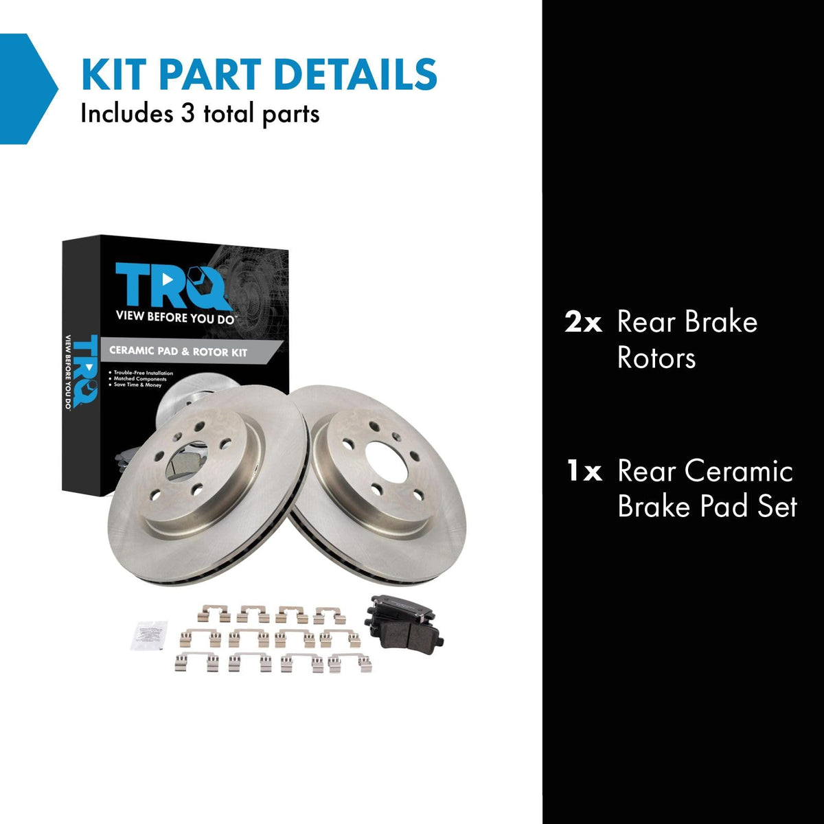 Ceramic Brake Pad & Rotor KitKit Includes(1) Rear Ceramic Brake Pad Set(2) Rear Brake RotorsFitmentCompatible with: 2013-15 Chevrolet Malibu Rear with 315 mm Diameter Rear RotorsCompatible with: 2014-20 Chevrolet Impala RearCompatible with: 2012-16 Buick LaCrosse Rear with Vented Rear RotorsCompatible with: 2013-19 Cadillac XTS Rear without Heavy Duty BrakesCompatible with: 2010-11 Buick LaCrosse RearCompatible with: 2016 Chevrolet Malibu Limited Rear with 315 mm Diameter Rear RotorsCompatible with: 2011 Buick Regal L4 2.0L RearCompatible with: 2012 Buick Regal GS RearCompatible with: 2016 Buick Regal L4 2.0L Gas Engine RearCompatible with: 2016 Buick Regal L4 2.4L Flex Fuel RearCompatible with: 2014 Buick Regal RearCompatible with: 2015 Buick Regal Rear with 315 mm Diameter Rear RotorsCompatible with: 2013 Buick Regal L4 2.0L RearCompatible with: 2017 Buick Regal Base Model Rear with 17 Inch WheelsCompatible with: 2017 Buick Regal GS Rear with 17 Inch WheelsCompatible with: 2017 Buick Regal Sport Touring Rear with 17 Inch WheelsCompatible with: 2011 Saab 9-5 Rear with Vented Rear RotorsProduct AttributesRear Brake Rotor Diameter: 12.40 in. (315mm)Wheel Lug Count: 5 LugBrake Pad Friction Material: CeramicBrake Pad Bonding Type: Premium PosiRear Brake Rotor Venting Type: VentedProduct Features Positive Molded - Less dust resulting in clean wheels G3000 Casting Alloy - Reduced noise and improved wear resistance Application Specific Design - Extended service life, no modificationsItem DetailsTRQ brake kits are designed to restore your brake system to like-new performance. TRQ brake pads are positive molded, thermal scorched, chamfered, and utilize a multi-layer shim for enhanced performance and service life. TRQ rotors have a non-directional finish that reduces the break-in period for new rotors as well as reducing vibrations throughout the rotors lifecycle. All products are fit and road-tested in our Massachusetts R&D facility to ensure we deliver on our promise of Trusted Reliable Quality.Reference NumbersAimco: 55179Bendix: PRT6073Buick: 13237768, 20965713, 20978663, 22846359, 22846360, 22846361Cadillac: 22846360, 22846361Chevrolet: 22846359, 22846361DIY Solutions: BFS01009, BFS01383DuraGo: BR900900General Motors: 13501290, 13501314, 13592623Raybestos Brakes: 580771, 580771FZN, 580771P, 580771PER, 580771R, EHT1430HSaab: 13237768, 13338368Wagner: BD180390