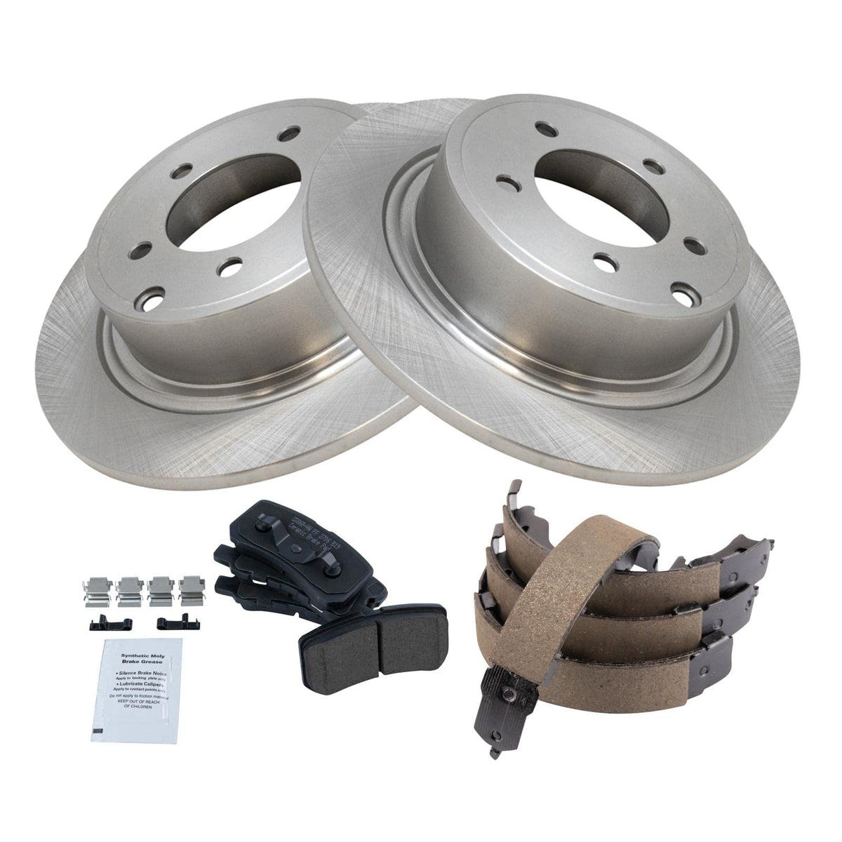 Ceramic Brake Pad & Rotor KitKit Includes(1) Rear Ceramic Brake Pad Set(1) Rear Parking Brake Shoe Set(2) Rear Brake RotorsFitmentCompatible with: 2007-17 Jeep Patriot Rear with 302 mm Diameter Rear Rotors with Parking ShoesCompatible with: 2007-17 Jeep Compass Rear with 302 mm Diameter Rear Rotors with Parking ShoesCompatible with: 2008-13 Dodge Avenger Rear with 302 mm Diameter Rear Rotors with Parking ShoesCompatible with: 2011-14 Chrysler 200 Rear with 302 mm Diameter Rear Rotors with Parking ShoesCompatible with: 2007-10 Chrysler Sebring Rear with 302 mm Diameter Rear Rotors with Parking ShoesCompatible with: 2008-09 Dodge Caliber SRT-4 Rear with Parking ShoesCompatible with: 2008-11 Mitsubishi Lancer GTS Rear with Parking ShoesCompatible with: 2012-14 Mitsubishi Lancer GT Rear with Parking ShoesCompatible with: 2010-11 Mitsubishi Lancer GTS Sportback Rear with Parking ShoesCompatible with: 2009-11 Mitsubishi Outlander SE with 5 Passenger Seating Rear with Parking ShoesCompatible with: 2009-11 Mitsubishi Outlander ES with 5 Passenger Seating Rear with Parking ShoesCompatible with: 2011 Mitsubishi Outlander Sport Rear with Parking ShoesCompatible with: 2008 Mitsubishi Outlander ES Rear with Parking ShoesCompatible with: 2008 Mitsubishi Outlander SE Rear with Parking ShoesProduct AttributesBrake Pad Friction Material: CeramicProduct Features Positive Molded - Less dust resulting in clean wheels G3000 Casting Alloy - Reduced noise and improved wear resistance Application Specific Design - Extended service life, no modificationsItem DetailsTRQ brake kits are designed to restore your brake system to like-new performance. TRQ brake pads are positive molded, thermal scorched, chamfered, and utilize a multi-layer shim for enhanced performance and service life. TRQ rotors have a non-directional finish that reduces the break-in period for new rotors as well as reducing vibrations throughout the rotors lifecycle. All products are fit and road-tested in our Massachusetts R&D facility to ensure we deliver on our promise of Trusted Reliable Quality.Reference NumbersAimco: 53043Bendix: PRT5896Chrysler: 68020256AA, 68028671AADodge: 68020256AA, 68028671AADuraGo: BR900750Hollander: 533-50158Jeep: 68028671AAMitsubishi: 4605A265, 4605A487, MN116286, MR510544, MZ690183Raybestos Brakes: 780541, 780541FZN, 780541P, 780541R, 886PG, EHT868H, MGD868CH, SGD868CWagner Brake: Z886Wagner: BD126574
