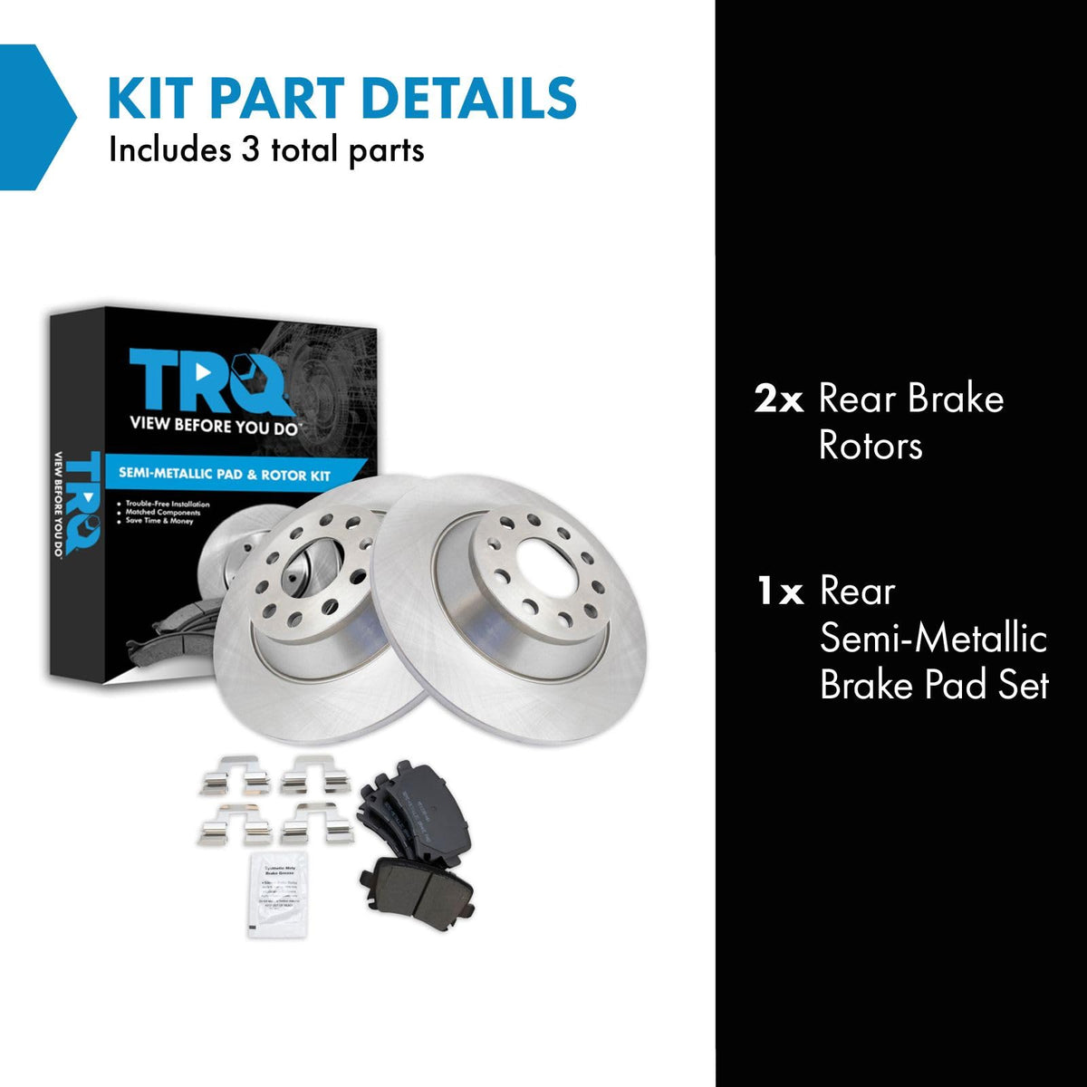 Semi-Metallic Brake Pad & Rotor KitKit Includes(1) Rear Semi-Metallic Brake Pad Set(2) Rear Brake RotorsFitmentCompatible with: 2008 Audi A6 Quattro Rear with 11.9 in. 302mm Diameter Rear RotorsCompatible with: 2006 Audi A6 Quattro Rear with 11.9 in. 302mm Diameter Rear RotorsCompatible with: 2007 Audi A6 Quattro Rear with 11.9 in. 302mm Diameter Rear RotorsCompatible with: 2011 Audi A6 Quattro Rear with 11.9 in. 302mm Diameter Rear RotorsCompatible with: 2005 Audi A6 Quattro Rear with 11.9 in. 302mm Diameter Rear RotorsCompatible with: 2010 Audi A6 Quattro Rear with 11.9 in. 302mm Diameter Rear RotorsCompatible with: 2009 Audi A6 Quattro Rear with 11.9 in. 302mm Diameter Rear RotorsCompatible with: 2008 Audi A6 Rear with 11.9 in. 302mm Diameter Rear RotorsCompatible with: 2006 Audi A6 Rear with 11.9 in. 302mm Diameter Rear RotorsCompatible with: 2007 Audi A6 Rear with 11.9 in. 302mm Diameter Rear RotorsCompatible with: 2010 Audi A6 Rear with 11.9 in. 302mm Diameter Rear RotorsCompatible with: 2009 Audi A6 Rear with 11.9 in. 302mm Diameter Rear RotorsCompatible with: 2005 Audi A6 Rear with 11.9 in. 302mm Diameter Rear RotorsProduct AttributesBrake Pad Bonding Type: Premium PosiBrake Pad Friction Material: Semi-MetallicProduct Features Positive Molded - Less dust resulting in clean wheels G3000 Casting Alloy - Reduced noise and improved wear resistance Application Specific Design - Extended service life, no modificationsItem DetailsTRQ brake kits are designed to restore your brake system to like-new performance. TRQ brake pads are positive molded, thermal scorched, chamfered, and utilize a multi-layer shim for enhanced performance and service life. TRQ rotors have a non-directional finish that reduces the break-in period for new rotors as well as reducing vibrations throughout the rotors lifecycle. All products are fit and road-tested in our Massachusetts R&D facility to ensure we deliver on our promise of Trusted Reliable Quality.Reference NumbersAimco: 34304AmeriBRAKES: 411490, PR11490Audi: 1K0698451B, 1K0698451D, 1K0698451G, 1K0698451K, 4F0698451A, 4F0698451D, 8E0698451F, 8E0698451J, 8E0698451MAuto Extra: AX900680Autopart International: 1407-55597, 1407-77146, 1427-530178, 55597, 77146Beck/Arnley: 083-3206Bendix Global: PRT5785Bendix: PRT5785Centric Parts: 120.33104, 121.33104Dura Corp: BR900680DuraGo: BR900680, P980465FREMAX BRAKE ROTORS AND DRUMS: BD5313IMC: 405-54-041, 405-54-103, 40554041253, 40554041345, 40554041398, 40554041500, 40554041501, 40554041529, 40554109501NAPA: 880465OMNIPARTS: 13067068, 13107068Promax: 14-34304, 20-34304Pronto: 34304, BR900680QBP International: EC34304, Q34304Qualis: 45402Raybestos Brakes: 980465, 980465FZN, 980465P, 980465R, EHT1108HSeat: 1K0698451KTransglobe Automotive: GBC34304, GC34304Transit: 8-980465Volkswagen: 1K0698451E, 1K0698451F, 1K0698451G, 1K0698451H, 1K0698451K, 3C0698451, 3C0698451A, 3C0698451B, 5N0698451Wearever: YH145785Winhere: 441619