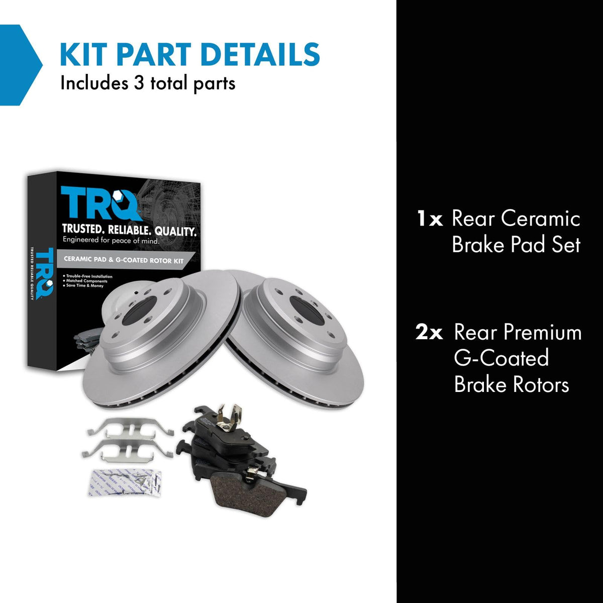 Ceramic Brake Pad & Rotor KitKit Includes(1) Rear Ceramic Brake Pad Set(2) Rear Premium G-Coated Brake RotorsFitmentCompatible with: 2015 BMW 328i xDrive with 12.99 in. 330mm Diameter Rear Rotors without Blue Painted Calipers Rear Ceramic Premium G-Coated Brake Pad & Rotor KitCompatible with: 2016 BMW 328i with 12.99 in. 330mm Diameter Rear Rotors without Blue Painted Calipers without M Sport Package Rear Ceramic Premium G-Coated Brake Pad & Rotor KitCompatible with: 2017-20 BMW 430i with 12.99 in. 330mm Diameter Rear Rotors without Blue Painted Calipers without M Sport Package Rear Ceramic Premium G-Coated Brake Pad & Rotor KitCompatible with: 2017-20 BMW 430i Gran Coupe with 12.99 in. 330mm Diameter Rear Rotors without Blue Painted Calipers without M Sport Package Rear Ceramic Premium G-Coated Brake Pad & Rotor KitCompatible with: 2016 BMW 328i xDrive with 12.99 in. 330mm Diameter Rear Rotors without Blue Painted Calipers without M Sport Package Rear Ceramic Premium G-Coated Brake Pad & Rotor KitCompatible with: 2017-20 BMW 430I xDrive Gran Coupe with 12.99 in. 330mm Diameter Rear Rotors without Blue Painted Calipers without M Sport Package Rear Ceramic Premium G-Coated Brake Pad & Rotor KitCompatible with: 2017-20 BMW 430I xDrive with 12.99 in. 330mm Diameter Rear Rotors without Blue Painted Calipers without M Sport Package Rear Ceramic Premium G-Coated Brake Pad & Rotor KitCompatible with: 2015-16 BMW 428i Gran Coupe with 12.99 in. 330mm Diameter Rear Rotors without Blue Painted Calipers without M Sport Package Rear Ceramic Premium G-Coated Brake Pad & Rotor KitCompatible with: 2015-16 BMW 428i xDrive Gran Coupe with 12.99 in. 330mm Diameter Rear Rotors without Blue Painted Calipers without M Sport Package Rear Ceramic Premium G-Coated Brake Pad & Rotor KitCompatible with: 2016 BMW 428i with 12.99 in. 330mm Diameter Rear Rotors without Blue Painted Calipers without M Sport Package Rear Ceramic Premium G-Coated Brake Pad & Rotor KitCompatible with: 2016 BMW 428i xDrive with 12.99 in. 330mm Diameter Rear Rotors without Blue Painted Calipers without M Sport Package Rear Ceramic Premium G-Coated Brake Pad & Rotor KitProduct AttributesRear Brake Rotor Diameter: 12.99 in. (330mm)Wheel Lug Count: 5 LugBrake Pad Friction Material: CeramicBrake Rotor Coating: Premium G-CoatedBrake Pad Bonding Type: Premium PosiBrake Rotor Venting Type: VentedProduct Features Positive Molded: Less dust resulting in clean wheels Electrostatic Coated: Long-lasting rust protection G3000 Casting Alloy: Reduced noise and improved wear resistance Application Specific Design: Extended service life, no modificationsItem DetailsTRQ brake kits are designed to restore your brake system to like-new performance. TRQ brake pads are positive molded, thermal scorched, chamfered, and utilize a multi-layer shim for enhanced performance and service life. TRQ G-coated rotors have long-lasting rust prevention, perfect for wheels with large openings that expose the rotor and rotor hat during daily drives. All products are fit and road-tested in our Massachusetts R&D facility to ensure we deliver on our promise of Trusted Reliable Quality.Reference NumbersBMW: 34206799809, 34206873094, 34216850569, 34216873093Raybestos Brakes: PGD1613C