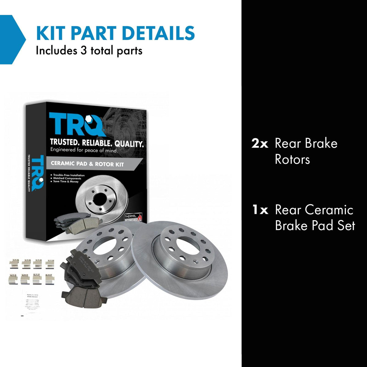 Ceramic Brake Pad & Rotor KitKit Includes(1) Rear Ceramic Brake Pad Set(2) Rear Brake RotorsFitmentCompatible with: 2012-14 VW Passat RearCompatible with: 2011-12 VW Jetta Rear with 272 mm Diameter Rear RotorsCompatible with: 2014 VW Jetta TDI Wagon L4 2.0L Rear with 272 mm Diameter Rear RotorsCompatible with: 2014 VW Jetta S Sedan L5 2.5L Rear with 272 mm Diameter Rear RotorsCompatible with: 2014 VW Jetta S Wagon L5 2.5L Rear with 272 mm Diameter Rear RotorsCompatible with: 2014 VW Jetta SE Sedan L5 2.5L Rear with 272 mm Diameter Rear RotorsCompatible with: 2014 VW Jetta SE Wagon L5 2.5L Rear with 272 mm Diameter Rear RotorsCompatible with: 2013 VW Jetta Hybrid SE Sedan Rear with 272 mm Diameter Rear RotorsCompatible with: 2013 VW Jetta Hybrid Sedan Rear with 272 mm Diameter Rear RotorsCompatible with: 2013 VW Jetta S Wagon Rear with 272 mm Diameter Rear RotorsCompatible with: 2013 VW Jetta GLI Sedan Rear with 272 mm Diameter Rear RotorsCompatible with: 2013 VW Jetta S Sedan Rear with 272 mm Diameter Rear RotorsCompatible with: 2013 VW Jetta Hybrid SEL Sedan Rear with 272 mm Diameter Rear RotorsCompatible with: 2013 VW Jetta TDI Wagon Rear with 272 mm Diameter Rear RotorsCompatible with: 2013 VW Jetta SE Wagon Rear with 272 mm Diameter Rear RotorsCompatible with: 2015 VW Passat TDI SEL Premium To 6/30/14 Production Date RearCompatible with: 2015 VW Passat TDI SE To 6/30/14 Production Date RearCompatible with: 2010 VW Jetta SE Rear with 272 mm Diameter Rear RotorsCompatible with: 2010 VW Jetta Wolfsburg Edition Rear with 272 mm Diameter Rear RotorsCompatible with: 2010 VW Jetta S Rear with 272 mm Diameter Rear RotorsCompatible with: 2010 VW Jetta TDI Rear with 272 mm Diameter Rear RotorsCompatible with: 2010 VW Jetta SEL Rear with 272 mm Diameter Rear RotorsCompatible with: 2009-16 VW Eos Rear with 272 mm Diameter Rear RotorsCompatible with: 2012 VW Beetle Rear with 272 mm Diameter Rear RotorsCompatible with: 2013-14 VW GTI Rear with 272 mm Diameter Rear RotorsCompatible with: 2013-14 VW Golf Rear with 272 mm Diameter Rear RotorsCompatible with: 2012 VW GTI RearCompatible with: 2012 VW Golf RearCompatible with: 2010-13 Audi A3 Base Model Rear with 272 mm Diameter Rear RotorsCompatible with: 2011 VW Golf TDI Rear with 272 mm Diameter Rear RotorsCompatible with: 2010 VW Golf From 12/01/09 Production Date Rear with 272 mm Diameter Rear RotorsCompatible with: 2010-13 Audi A3 Quattro Rear with 272 mm Diameter Rear RotorsProduct AttributesRear Brake Rotor Diameter: 10.71 in. (272mm)Wheel Lug Count: 5 LugBrake Pad Friction Material: CeramicRear Brake Rotor Venting Type: SolidProduct Features Positive Molded - Less dust resulting in clean wheels G3000 Casting Alloy - Reduced noise and improved wear resistance Application Specific Design - Extended service life, no modificationsItem DetailsTRQ brake kits are designed to restore your brake system to like-new performance. TRQ brake pads are positive molded, thermal scorched, chamfered, and utilize a multi-layer shim for enhanced performance and service life. TRQ rotors have a non-directional finish that reduces the break-in period for new rotors as well as reducing vibrations throughout the rotors lifecycle. All products are fit and road-tested in our Massachusetts R&D facility to ensure we deliver on our promise of Trusted Reliable Quality.Reference NumbersAimco: 34431Audi: 5K0698451Bendix: PRT6086DuraGo: BR900930Hollander: 533-50274Raybestos Brakes: 980798, 980798FZN, 980798P, 980798R, EHT1456H, MGD1456CHVolkswagen: 1K0615601AA, 1KO615601AA, 2K5698451, 561615601, 561615601A, 5K0698451, 5K0698451A, 5Q0615601D, 5QM615601CWagner: BD180424