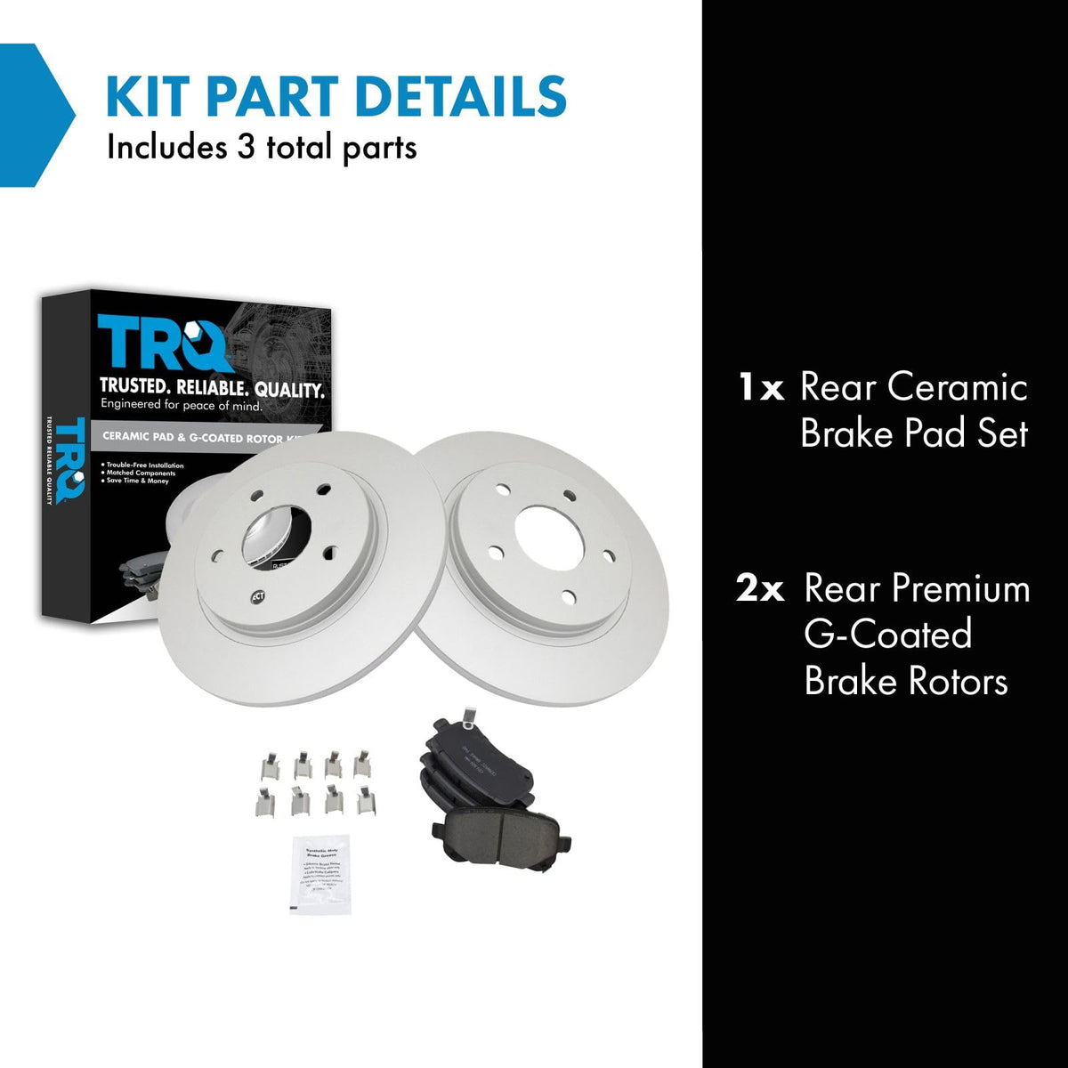 Ceramic Brake Pad & Rotor KitKit Includes(1) Rear Ceramic Brake Pad Set(2) Rear Premium G-Coated Brake RotorsFitmentCompatible with: 2008-11 Chrysler Town & Country Rear Ceramic Premium G-Coated Brake Pad & Rotor KitCompatible with: 2009-11 VW Routan Rear Ceramic Premium G-Coated Brake Pad & Rotor KitCompatible with: 2009-13 Dodge Journey Rear with 305 mm Diameter Rear Rotors Ceramic Premium G-Coated Brake Pad & Rotor KitCompatible with: 2012 Dodge Grand Caravan To 3/23/12 Production Date Rear with 305 mm Diameter Rear Rotors with Single Piston Front Calipers Ceramic Premium G-Coated Brake Pad & Rotor KitCompatible with: 2012 Ram Cargo Van To 3/23/12 Production Date Rear with 305 mm Diameter Rear Rotors with Single Piston Front Calipers Ceramic Premium G-Coated Brake Pad & Rotor KitCompatible with: 2012 VW Routan Rear with 305 mm Diameter Rear Rotors Ceramic Premium G-Coated Brake Pad & Rotor KitCompatible with: 2012 Chrysler Town & Country To 3/23/12 Production Date Rear with 305 mm Diameter Rear Rotors with Single Piston Front Calipers Ceramic Premium G-Coated Brake Pad & Rotor KitCompatible with: 2008-11 Dodge Grand Caravan Rear with 305 mm Diameter Rear Rotors Ceramic Premium G-Coated Brake Pad & Rotor KitProduct AttributesBrake Rotor Diameter: 12.01 in. (305mm)Wheel Lug Count: 5 LugBrake Pad Friction Material: CeramicBrake Rotor Coating: Premium G-CoatedBrake Pad Bonding Type: Premium PosiBrake Rotor Venting Type: SolidProduct Features Positive Molded: Less dust resulting in clean wheels Electrostatic Coated: Long-lasting rust protection G3000 Casting Alloy: Reduced noise and improved wear resistance Application Specific Design: Extended service life, no modificationsItem DetailsTRQ brake kits are designed to restore your brake system to like-new performance. TRQ brake pads are positive molded, thermal scorched, chamfered, and utilize a multi-layer shim for enhanced performance and service life. TRQ G-coated rotors have long-lasting rust prevention, perfect for wheels with large openings that expose the rotor and rotor hat during daily drives. All products are fit and road-tested in our Massachusetts R&D facility to ensure we deliver on our promise of Trusted Reliable Quality.Reference NumbersAamco: 53050Aimco: 53050Chrysler: 68029887AA, 68029887AB, 68044761AC, 68159138AADodge: 68029887AA, 68029887AB, 68159138AARam: 68159138AARaybestos Brakes: EHT1326H, MGD1326CHVolkswagen: 7B0698451, 7B0698451A