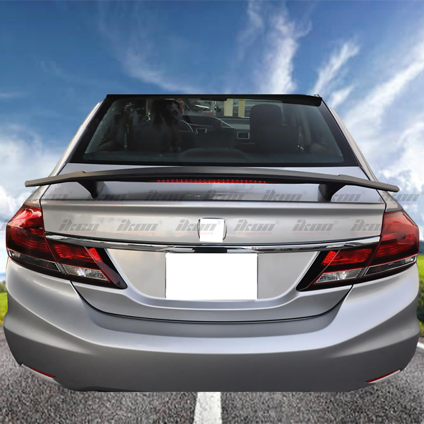 Q: What material is the IKON Style trunk spoiler made of?A: The trunk spoiler is made from high-quality ABS plastic (Acrylonitrile butadiene styrene), known for its durability and impact resistance, ensuring longevity and a sleek appearance.