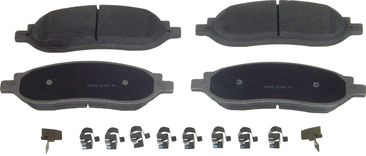 Q: What is the material composition of the Wagner MX1068 brake pads?A: The Wagner MX1068 brake pads are made from semi-metallic friction material, which is engineered for quiet operation and high performance, along with premium stainless-steel hardware included for select applications.