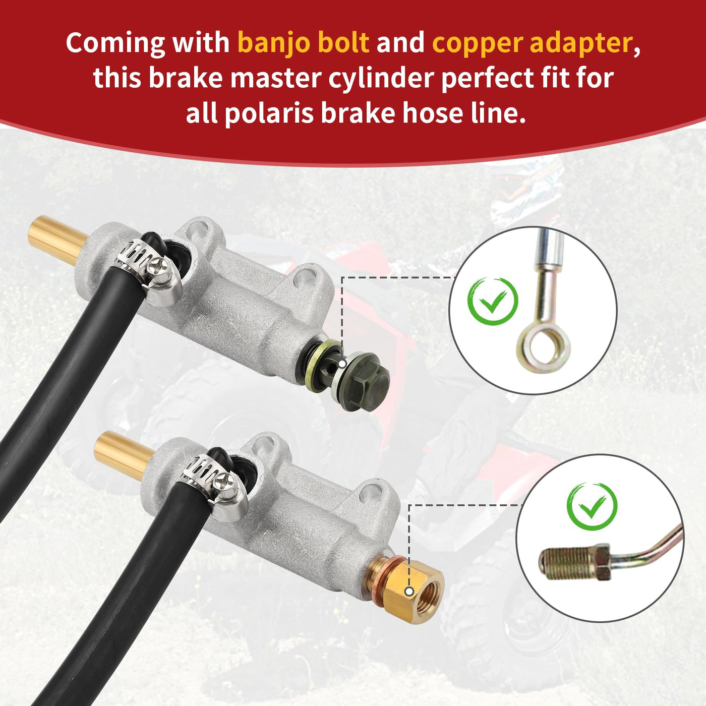Q: Does the rear brake master cylinder come with all necessary installation parts?A: Yes, the rear brake master cylinder assembly includes the banjo bolt and copper adapter, making it compatible with all Polaris brake hose lines. This ensures a smooth installation process.