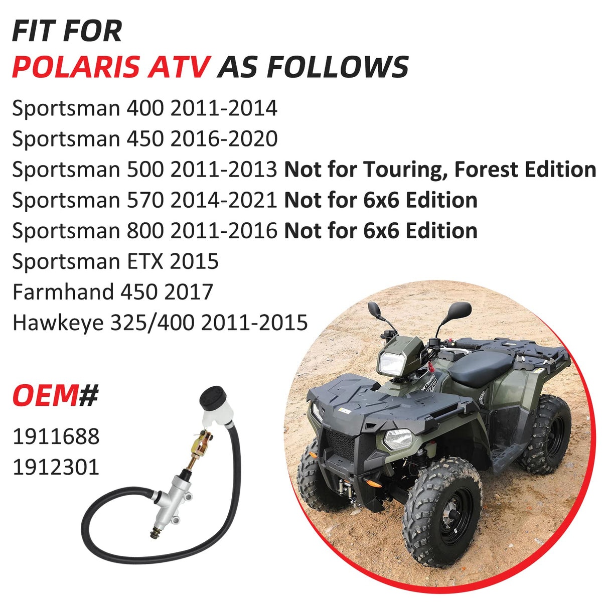 Oem#1911688 1912301PackageBrake Master Cylinder X 1Fit For Polaris Atv As Follows:Sportsman 400 2011-2014Sportsman 450 2016-2020Sportsman 500 2011-2013 Not For Touring, Forest EditionSportsman 570 2014-2021 Not For 6X6 EditionSportsman 800 2011-2016 Not For 6X6 EditionSportsman Etx 2015Farmhand 450 2017Hawkeye 325/400 2011-2015