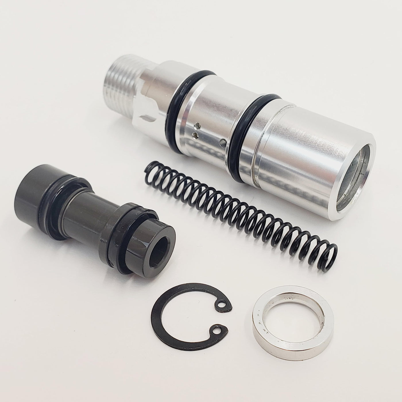 Q: What components are included in the master cylinder rebuild kit?A: The kit includes a Billet Aluminum Plunger/Piston Housing with O-Rings, a Metal Piston, Seals, Spring, Spacer, and Snap Ring, providing everything needed for a complete rebuild.