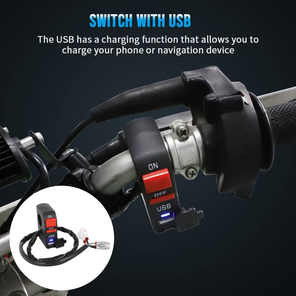 Q: How does the USB switch function in the light bar kit?A: The USB switch included with the light bar kit not only controls the light's operation but also allows you to charge devices such as your phone or navigation system while riding. This feature adds convenience and enhances the utility of the light bar.