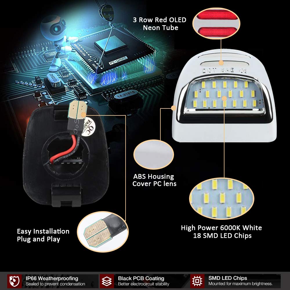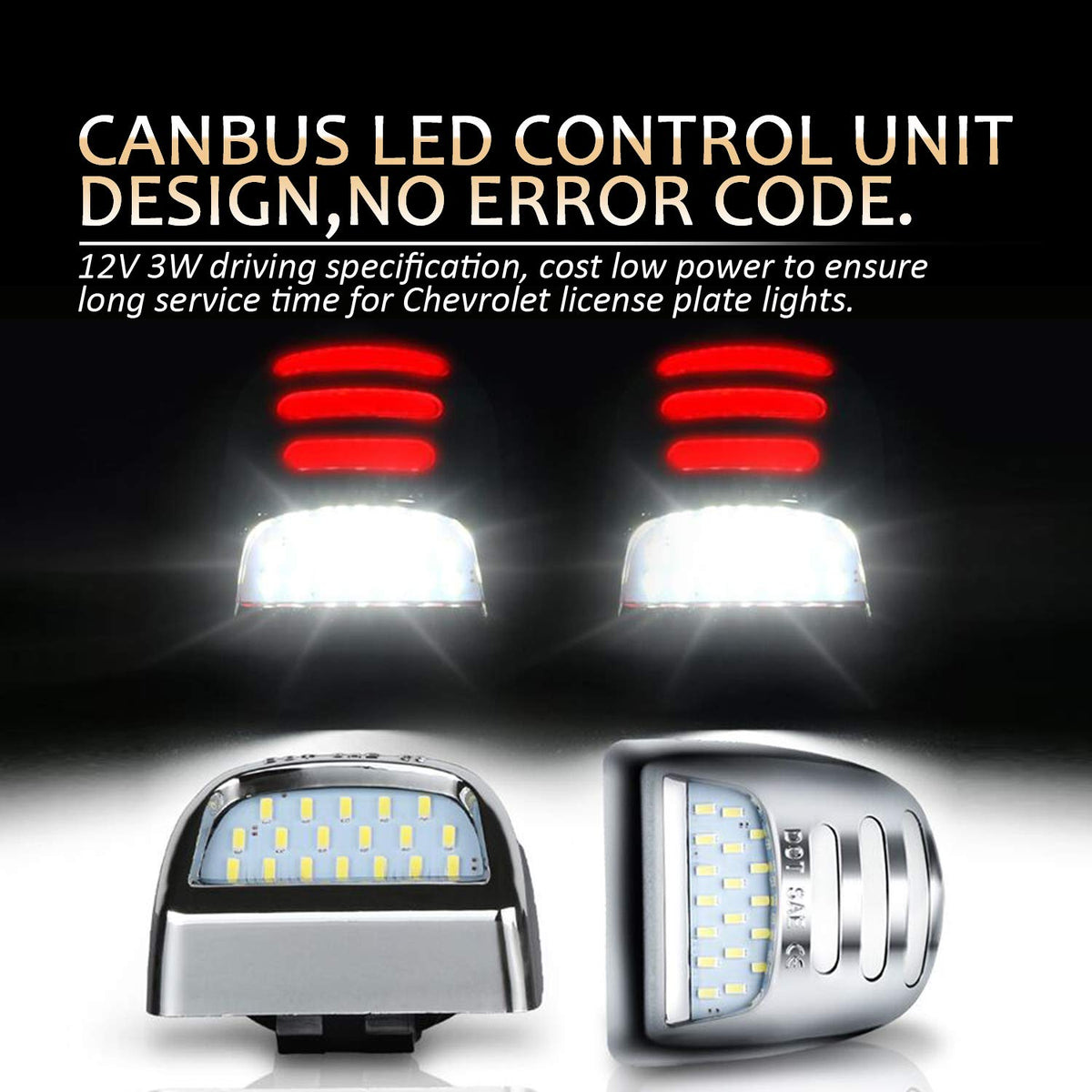 ?Fitment List?: 1999-2013 Chevy Silverado 1500/GMC Sierra 1500, 1999-2004 Chevy Silverado 2500/GMC Sierra 2500, 2001-2007 Chevy Silverado 3500/GMC Sierra 3500, 2007-2013 Chevy Silverado 3500 HD/Avalanche/GMC Sierra 3500 HD, 1999-2013 Chevy Silverado 1500 2500 HD/GMC Sierra 1500 2500 HD, 2000-2006 Chevy Suburban 1500 2500/Tahoe/GMC Yukon, 2002-2006 Cadillac Escalade, 2002-2013 Cadillac EXT, 2000-2006 GMC Yukon XL 1500/XL 2500. | ?High Intensity LED Chips?: Built with 100% advanced high brightness LED chips with intensity lighting output and low power consumption, which was 10x brighter than factroy light bulbs, give you a larger effective irradiation area and perfect light pattern, dramaticly improved the lighting on rear license plate visibility at night. Direct upgrade replacement part to replace the old or defective OEM license plate lights. | ?High Quality Performance?: These license plate lights are much brighter than stock lights, 3-row red OLED strips increase safety at night drivinng and give your vehicle more modern look. Built-in high power 18 SMD LED chips, made of high quality PC lens and chrome ABS plastic housing, 6000K white bright lights output maximize illumination and IP68 rated waterproof. Canbus LED control unit design, no error code. | ?Easy Installation?: Plug and Play insert to install in just minutes, Non-polarity sensitive, OEM Perfect fit and direct replacement, no need for any resistors or special modifications. Remove original housing bulbs and insert the upgrade version lights plug into the factory socket. | ?Package Including?: 1x pair of right and left side LED license plate lights. Product Come with 1 year warranty and lifetime support to Ensure 100% Satisfaction.