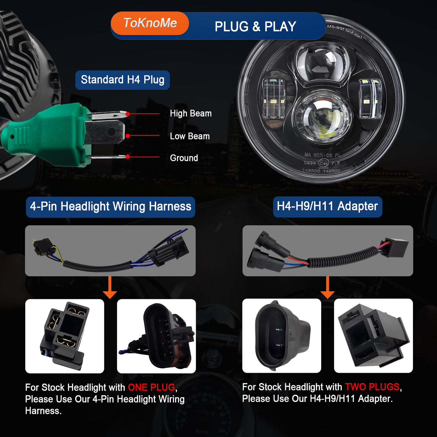 Q: Does the ToKnoMe LED Headlight require any special installation or adapters?A: The ToKnoMe LED Headlight features a plug-and-play design for easy installation. However, certain models like the 2014-2019 Street Glide Special and Road King Special may require an H4 to H9 adapter, which is included in the package.
