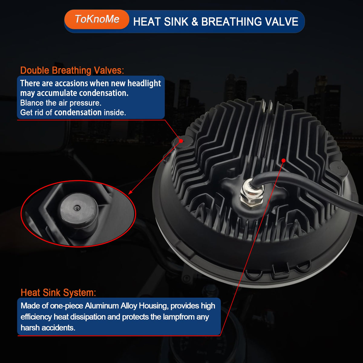 Q: How bright is the ToKnoMe LED Headlight compared to stock bulbs?A: The ToKnoMe LED Headlight is significantly brighter than stock halogen bulbs, providing 4800 lumens on high beam and 2800 lumens on low beam. This upgraded headlight is designed to offer a perfect beam pattern with no glare or dim spots, ensuring enhanced visibility during night rides.
