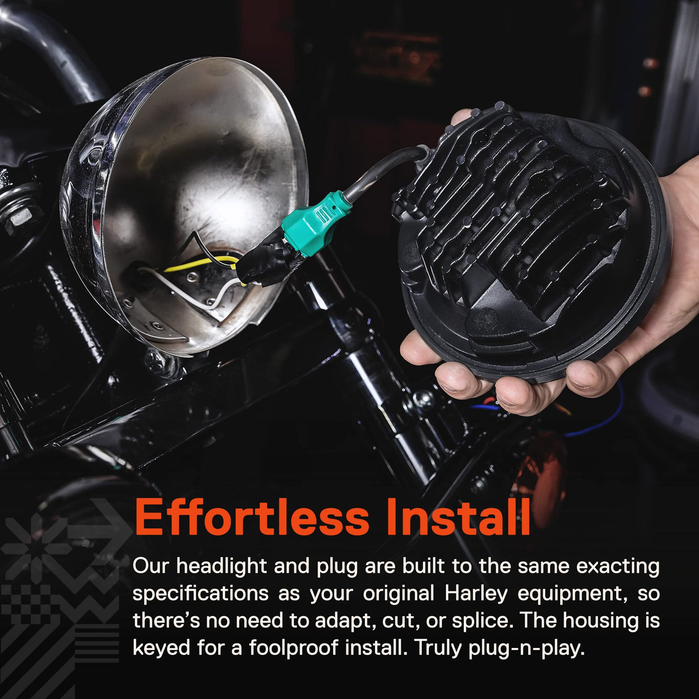 Q: Is the installation of the TRUE MODS LED headlight difficult?A: No, the installation of the TRUE MODS LED headlight is designed to be effortless. It features a plug-and-play design that matches the exact specifications of your original Harley equipment, eliminating the need for any cutting or splicing. The housing is keyed for a foolproof installation.