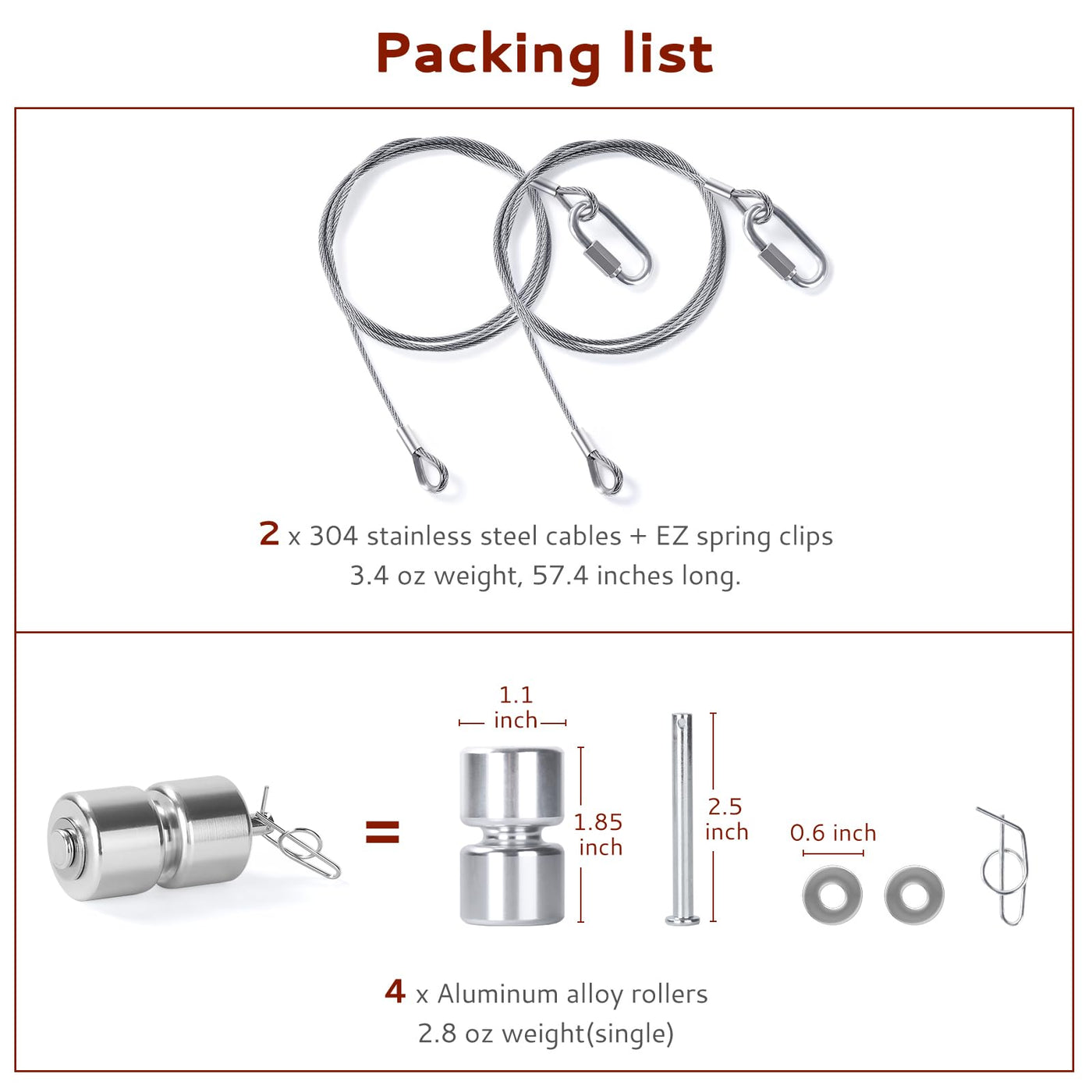 Q: What is included in the package of the lift cable kit?A: The package contains 2 stainless steel cables measuring 57.4 inches, 2 EZ spring clips, 4 rollers, 4 clevis pins, 4 locking rings, and 8 flat washers, providing all necessary components for installation.