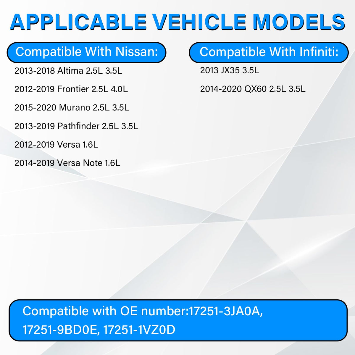 OE Part Numbers: 17251-3JA0A, 17251-9BD0E, 17251-1VZ0D. Ensure perfect compatibility by checking your vehicle's OE part number before purchase.