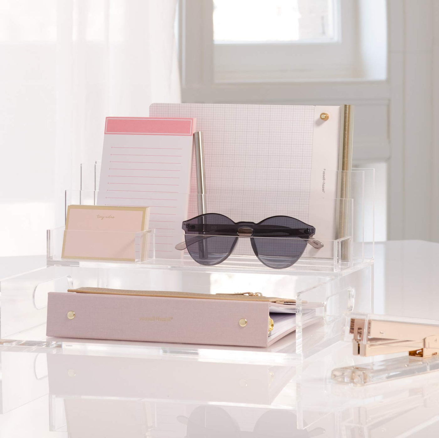 Q: What materials are used in the RUSSELL+HAZEL Acrylic Mini Desktop File Collator?A: The RUSSELL+HAZEL Acrylic Mini Desktop File Collator is made from durable hard cast acrylic, ensuring both elegance and long-lasting functionality.