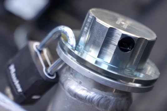 Beautifully CNC machined carbon steel fuel tank cap and adapter. Silver zinc-plated for corrosion resistance and durability. Built-in vent allows for pressure release at 1.5 psi and vacuum relief at 1.5 oz. Adapters have 'flats' machined on to the sides to assist tightening onto the tank. Fits all 2'' male threaded tanks. Cap is secured to adapter with any 5/16th diameter shackle padlock (not included). Inside gasket provides sealing and prevents spillage of the tank contents. May be susceptible to some spillage during the very brief venting time period.