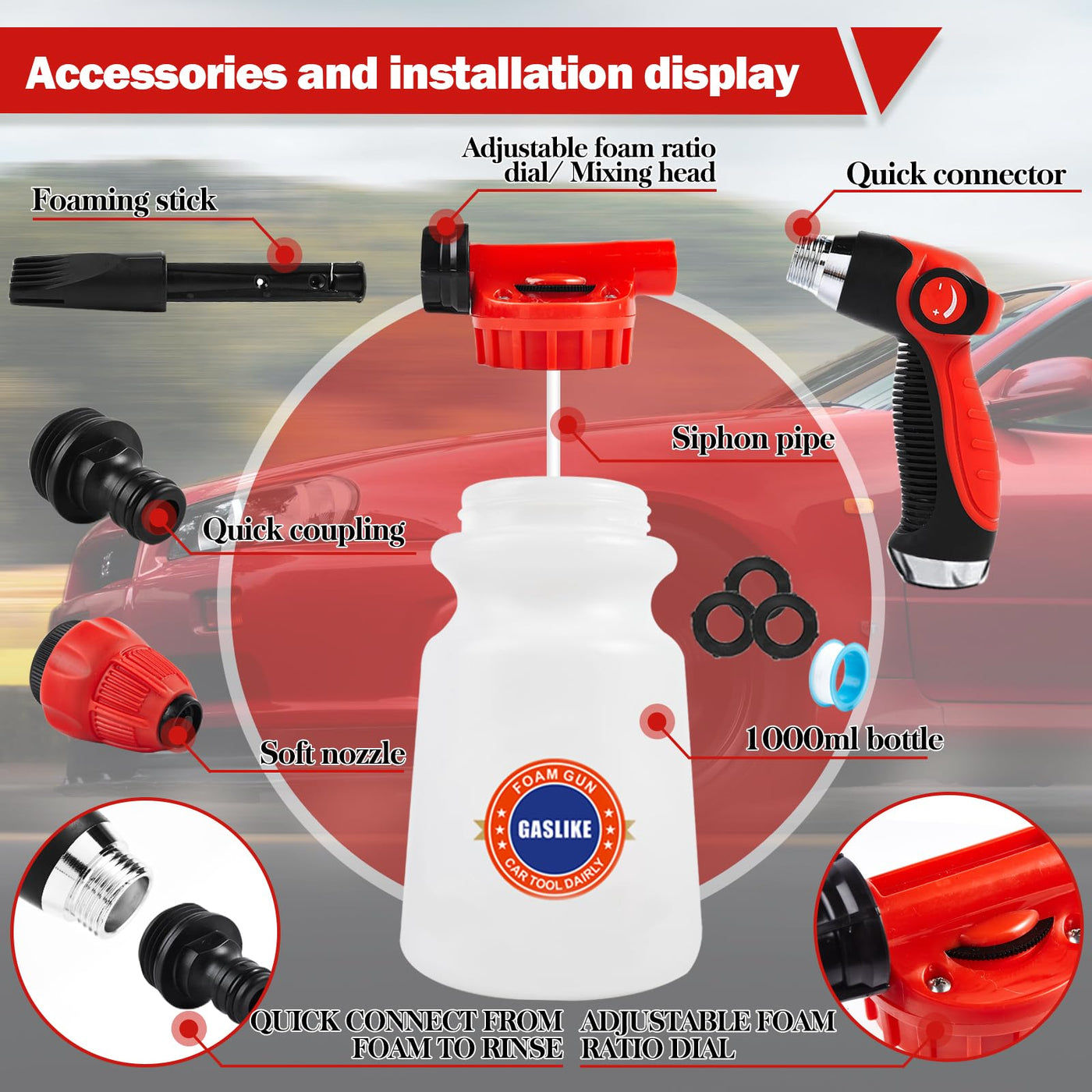 56Pcs Car Wash Cleaning Kit with Foam Gun, Car Wash Brush with Long Handle, Car Detailing Kit, Car Wheel Brush for Car Cleaning Supplies, Adjustable Hose Wash Sprayer-Quick Connector to Any Hose