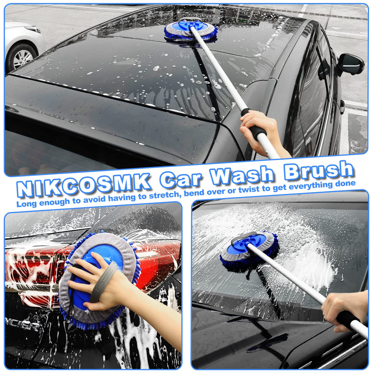 Q: How do I use the long handle on the car wash mop?A: The NIKCOSMK car wash mop comes with four sturdy aluminum alloy rods that can be easily assembled using a snap buckle design. This allows you to adjust the length to effectively reach high areas like the roofs of cars and RVs while maintaining a comfortable grip with its non-slip handle.
