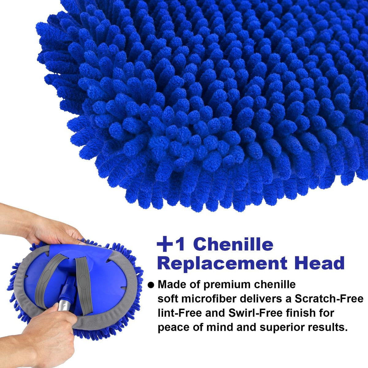 Q: Can the mop head be replaced, and what type of cleaning does it support?A: Yes, the mop head is removable and comes with a chenille scratch-free replacement head, perfect for gentle cleaning of cars, trucks, and even indoor surfaces.