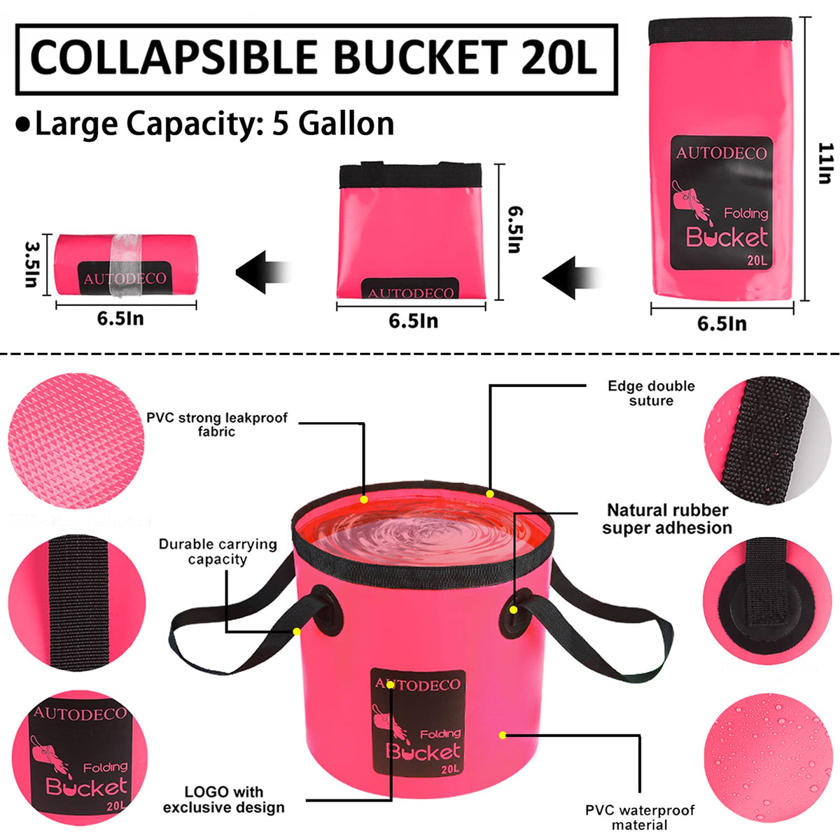 AUTODECO 22Pcs Car Wash Cleaning Tools Kit Set Features: 100% brand new and high quality 22 pieces of car cleaning kit with soft texture, give your car comprehensive protection Products Include: 1 Waterproof chenille microfiber wash mitt(8''*11''/20*28cm) 2 Super absorbent towel(15.7''*15.7''/40*40cm) 1 Microfiber wash sponge 1 Window water scraper 1 Car tire brush 1 Car wheel brush with handle 1 Mini duster for car air vent 6 Glass washer cleaning pieces 1 Car tire clearing stone hook 1 Car duster 4 Wax applicator pad 1 Portable collapsible bucket(20L/5 Gallon) 1 Storage bag(11.8''x9''x4''/30x23x10cm) About Wash Mitt: Upgraded extra large size mitt, roomy and suit for most hands size. With super thick, ultra absorbent microfiber strands. Skin-friendly waterproof lining-protects your hands! About Towel: 1. With enormous absorbency for drying 2. Attract grease, dirt particles and dust easily 3. Extremely plush, completely edgeless, super-soft, super-light, will not scratch paint when used properly. About Folding Bucket: Fully opened sizes: Diameter 11'' x height 11.8'', Weight: 0.6LB. Folded size: 6.5'' x 6.5''. Rolled up size: 3.5'' x 6.5''. Space-saving, lightweight and quite easy to carry with. Ideal for RV, camping, fishing, traveling, boating, hiking, gardening, picnic, outdoor activities, daily and car washing. Use it as fish bucket, ice bucket, fruits and veggies basket, travel basin, coaches buckets for baseball, etc. Scope of Kit Application: 1. Cleaness of toughest of grease, dirt, dust, and spills 2. Safe to use on paint, glass, metal or optical plastic 3. Can be used on all vehicle types, car, motorcycle, SUV, trucks, RVs trailers, buses, boat, and around the house, kitchen, bathtub, room dust