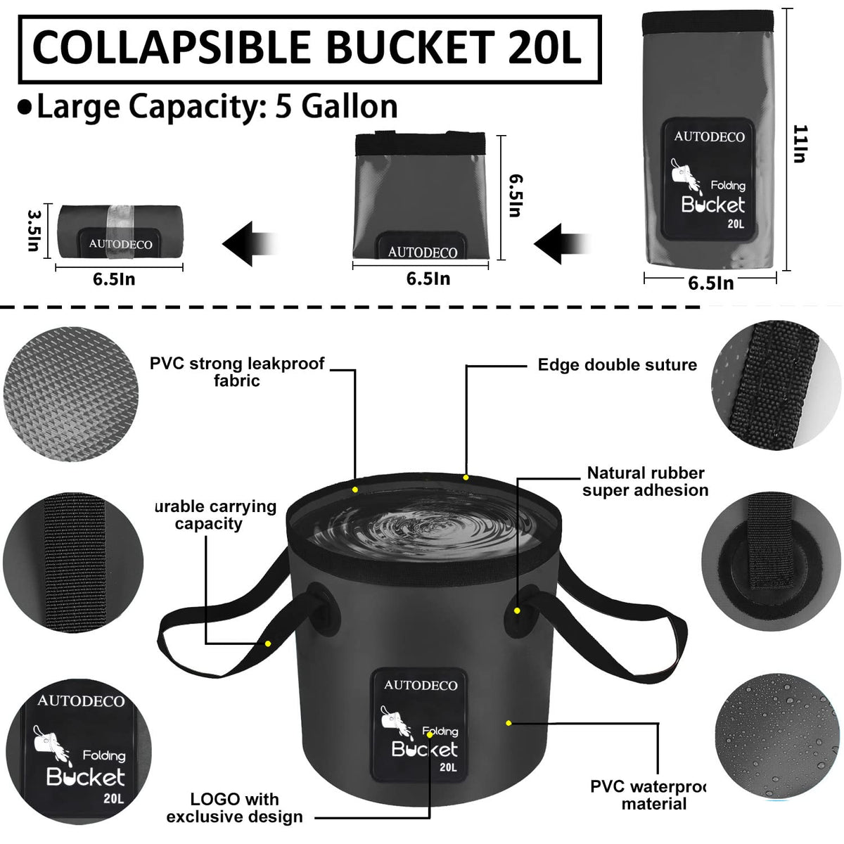 Q: Is the collapsible bucket easy to carry and store?A: Yes, the collapsible bucket is lightweight and designed for space-saving. It fully opens to a diameter of 11 inches and folds down to a compact size, making it easy to carry and store for various activities like camping and cleaning.