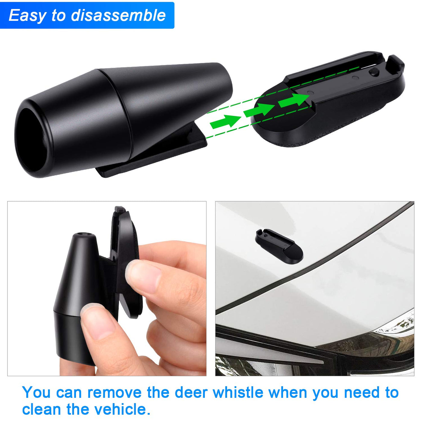 Q: Where should I install the deer whistles on my vehicle?A: For optimal performance, install the deer whistles on the front of the vehicle, preferably near the bumper or the car base. This location allows the whistles to effectively transmit sounds to alert deer in the vicinity.