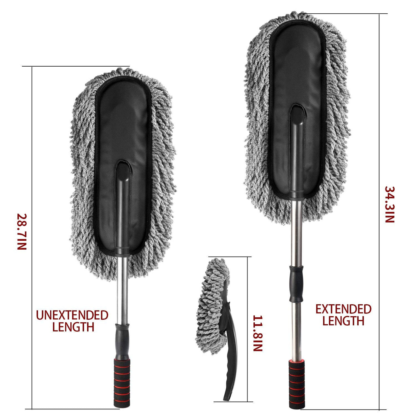 Q: Is the handle of the car duster adjustable?A: Yes, the Bargain Crusader Car Duster has an extendable and retractable handle. It can be extended up to 34.3 inches, making it easy to reach high and difficult areas like the car roof and dashboard corners.