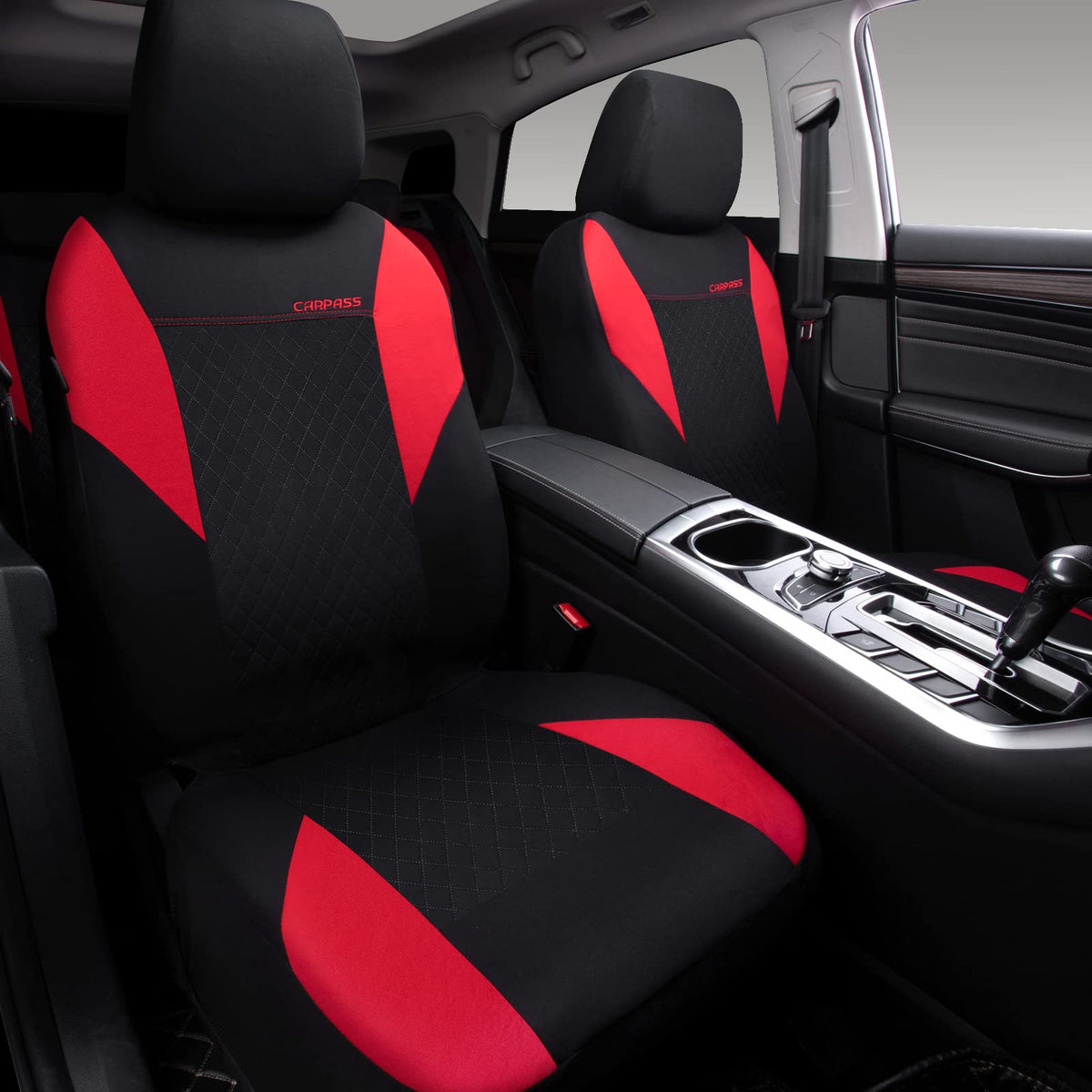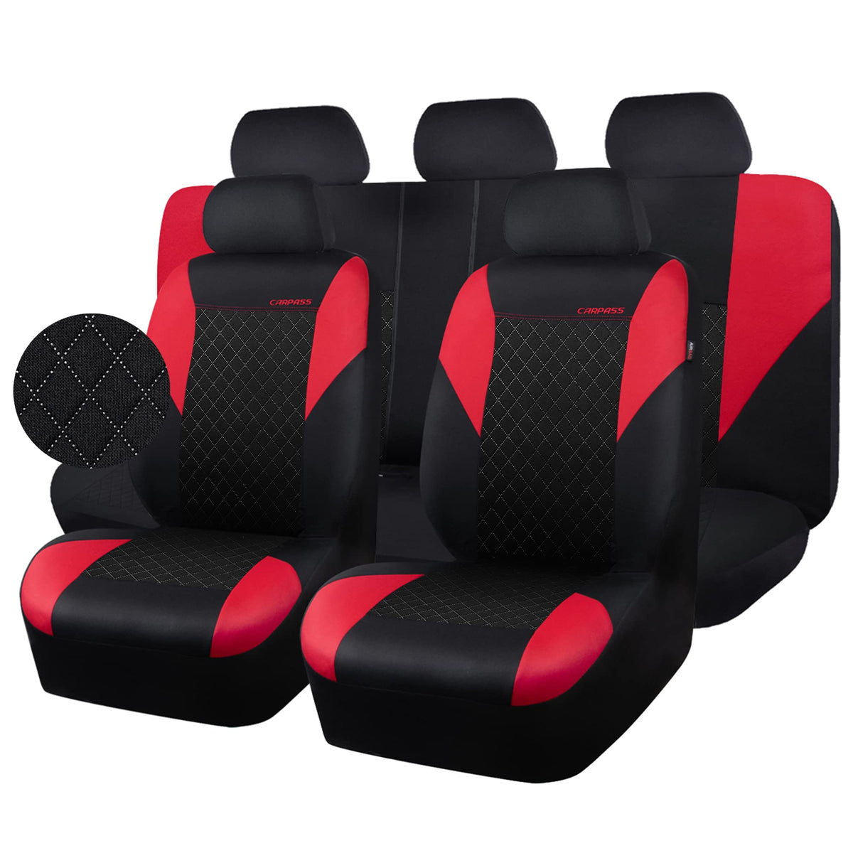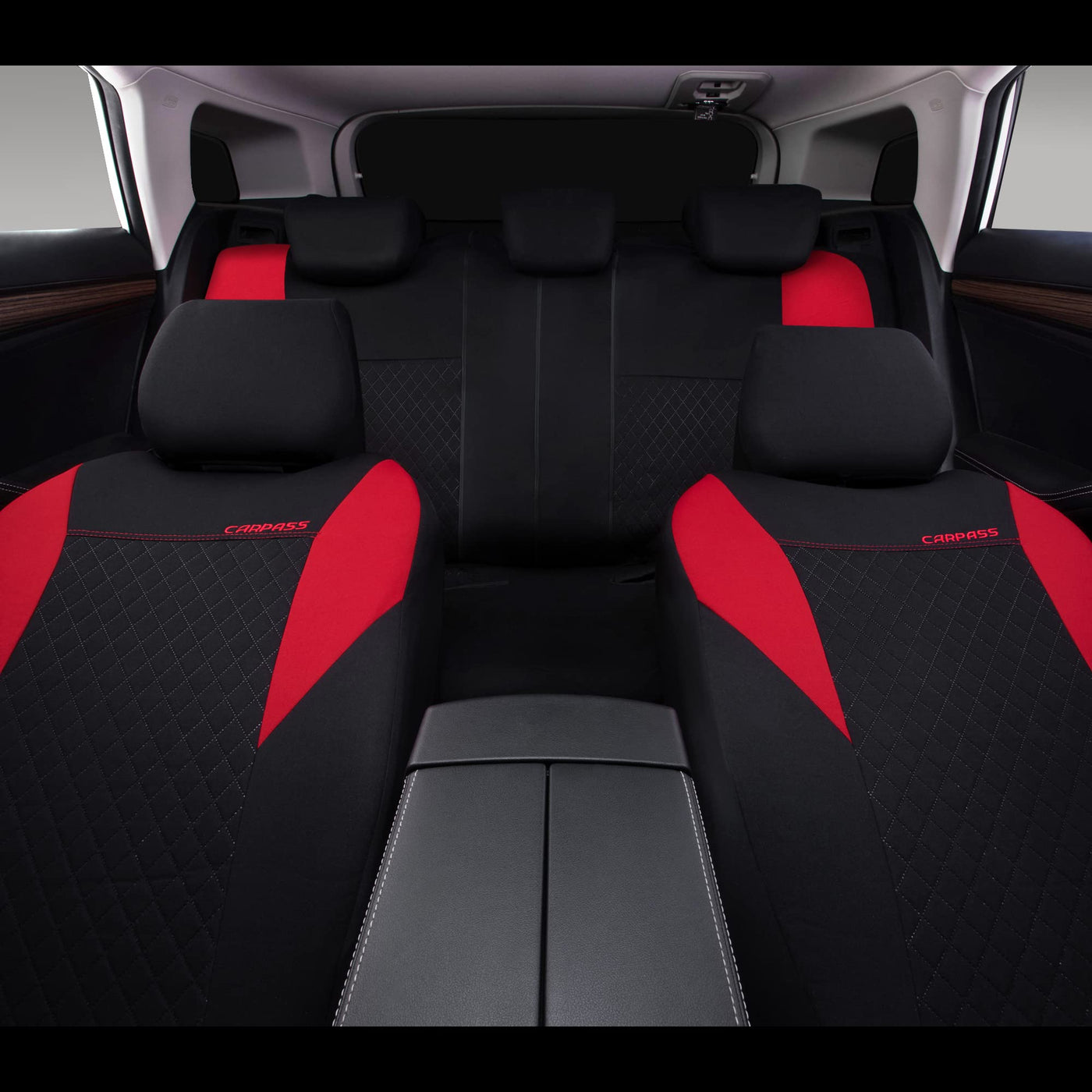 CAR PASS Ultrasonic Embossing Cloth Universal seat Covers-Breathable car seat Cover with 5mm Composite Sponge Inside,Airbag Compatible,2zipper Bench for Sedan,SUV,Truck(Black and Red,Full Set)