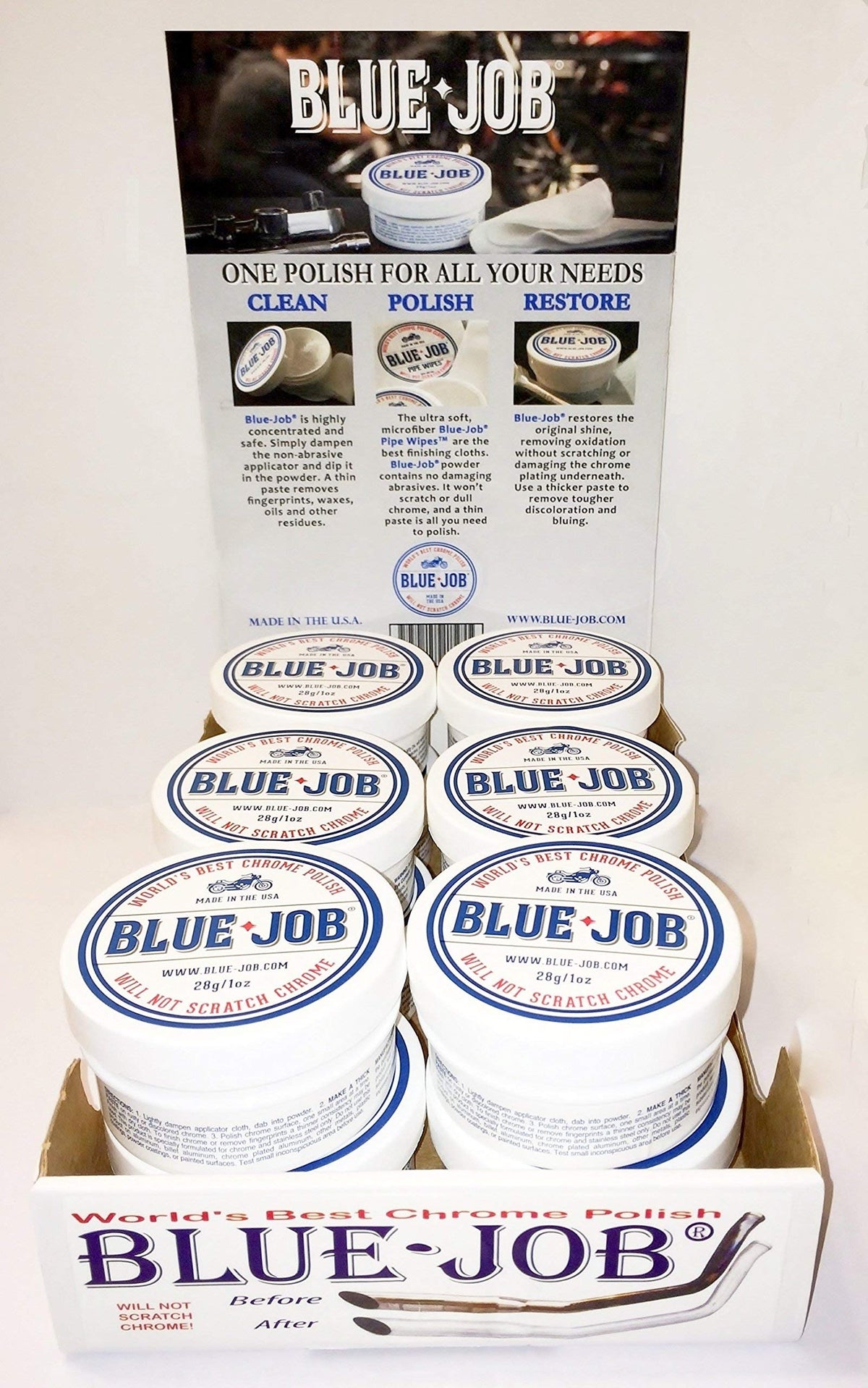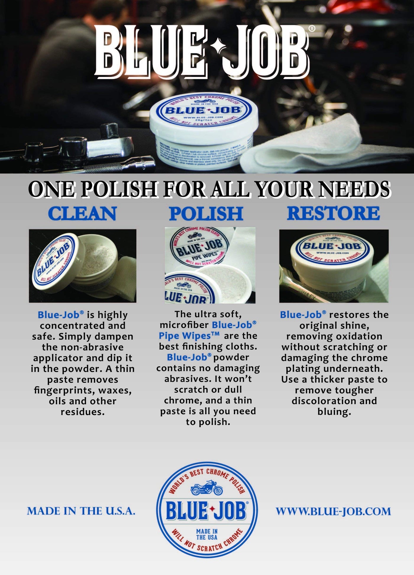 Blue-Job Chrome Polish Uses A Unique Non-Abrasive, Highly Concentrated, Powder Formula Just Dampen The Microfiber Applicator And Dip It In The Powder A Thin Paste Cleans And Polishes A Thicker Paste Removes Bluing And Tougher Discoloration It Will Not Scratch The Chrome Or Stainless Steel Directions: 1 Lightly Dampen Applicator Cloth, Dab Into Powder 2 Make A Thick Paste On Rusty Or Discolored Chrome 3 Polish Chrome Surface, One Small Area At A Time Finish With Dry Cloth To Finish Chrome Or Remove Fingerprints A Thinner Consistency May Be Used This Product Is Specially Formulated For Chrome And Stainless Steel Only Do Not Use This Product On Aluminum, Billet Aluminum, Chrome Plated Aluminum, Other Metals, Plastic Coatings, Powder Coatings, Or Painted Surfaces Test Small Inconspicuous Area Before Use