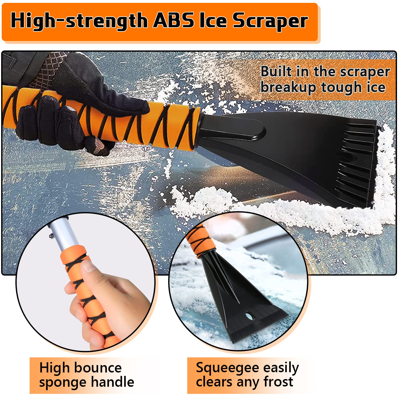 Q: What makes this snow brush effective for removing ice and snow from my car?A: This snow brush features PVC bristles that are both sturdy and soft, ensuring effective snow sweeping without scratching your car's paint or windshield. The design includes three rows of bristles for enhanced cleaning power.