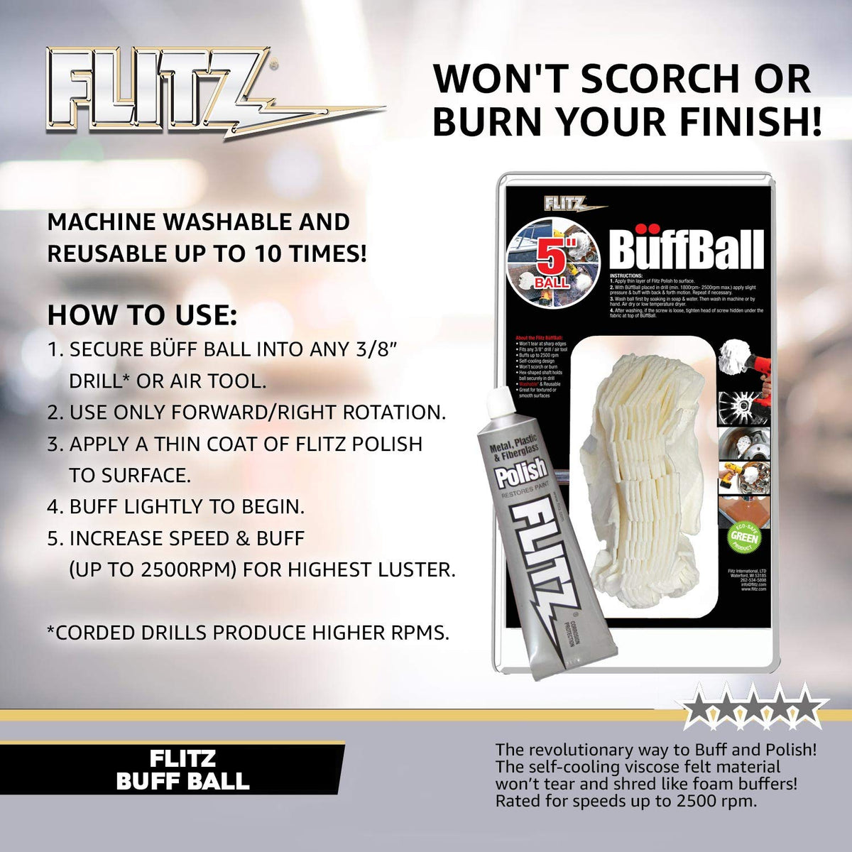 Q: Does the Buff Ball come with any additional products?A: Yes, with your purchase of the Flitz Buff Ball, you will receive a bonus 1.76 oz tube of Flitz Paste Polish, which enhances the buffing and polishing process.