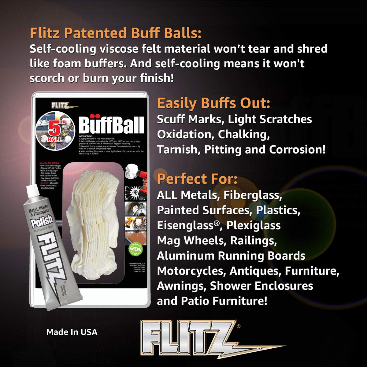 Q: What surfaces can the Flitz Buff Ball be used on?A: The Flitz Buff Ball can safely buff and polish a variety of surfaces including painted surfaces, metal, fiberglass, plastic, eisenglass, plexiglass, aluminum, railings, motorcycles, antiques, furniture, awnings, and shower enclosures.