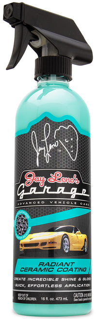 Q: What is Jay Leno's Garage Radiant Ceramic Coating?A: Jay Leno's Garage Radiant Ceramic Coating is a SiO2-based spray that offers an easy-to-use solution for paint protection, providing months of durable, water-beading capabilities while enhancing the shine and clarity of your vehicle's paint.