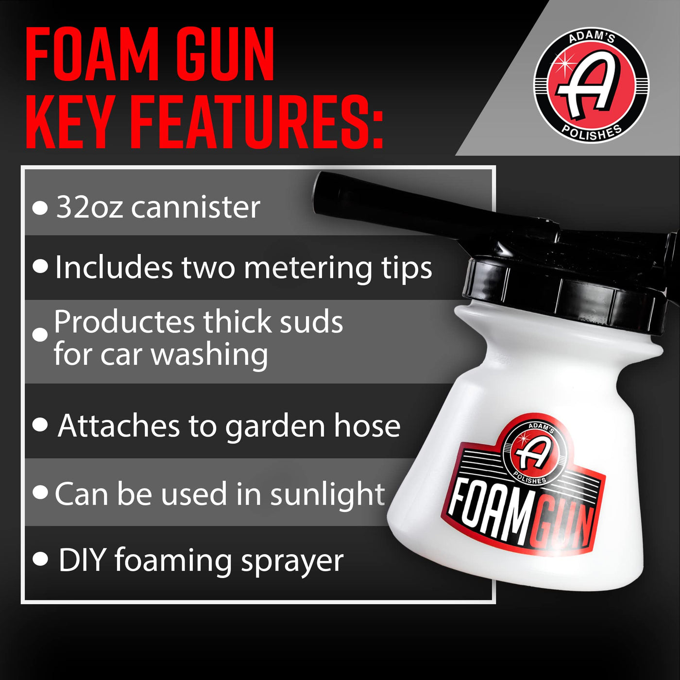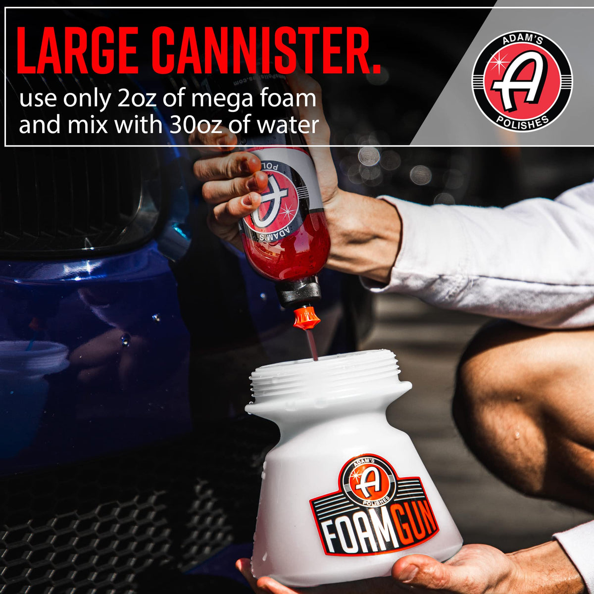 Q: What type of car shampoo should I use with the foam gun?A: For optimal results, we recommend using 4-5 ounces of your favorite car shampoo mixed with water in the 32-ounce canister. If using Adam’s Mega Foam, 2-3 ounces should suffice for a rich foam.