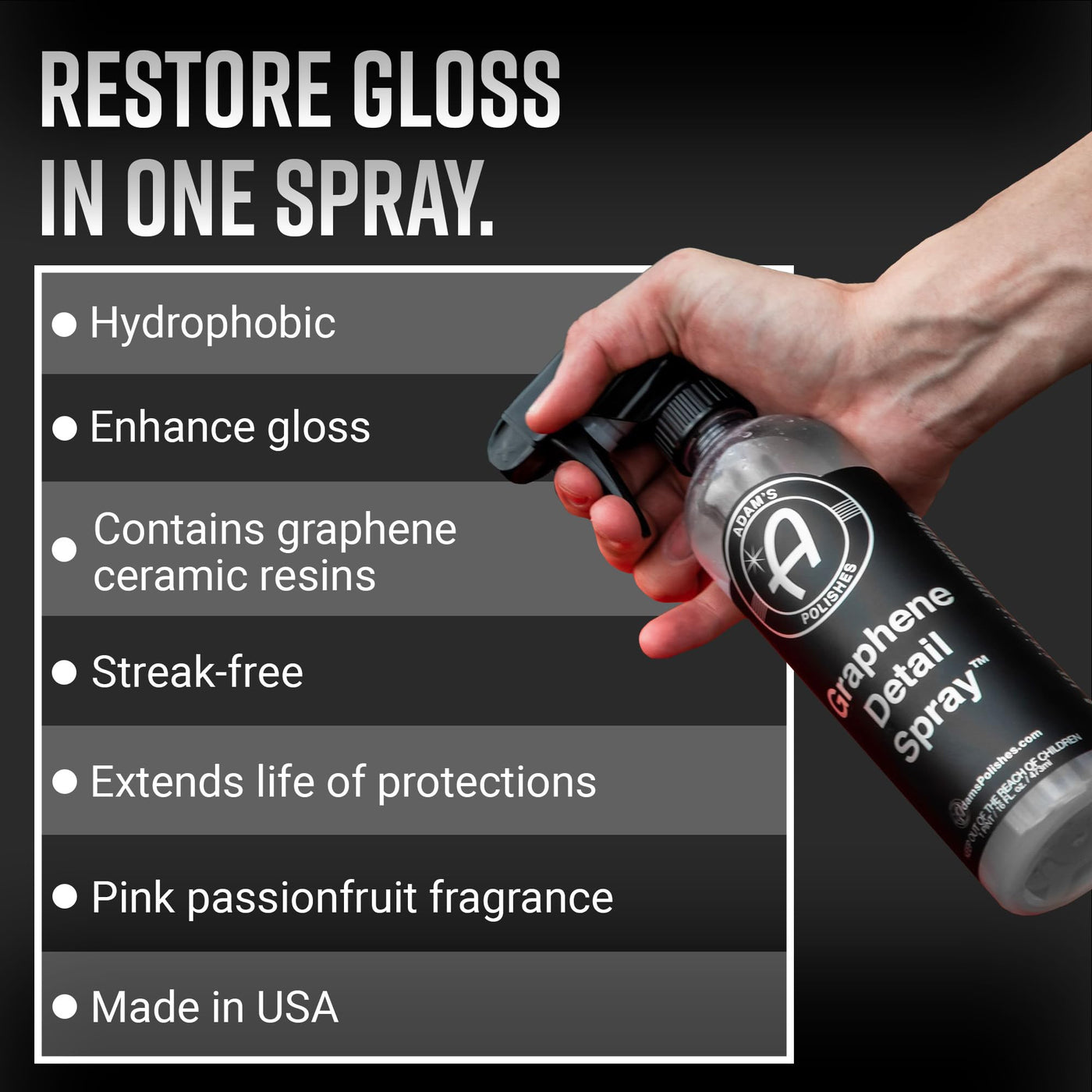 Adams Graphene Detail Spray is modeled after our most iconic and versatile product, Adams Detail Spray! Simply spray and wipe for a streak free, brilliant finish which now also provides additional slickness, gloss, depth of color and relentless water beading all its own.