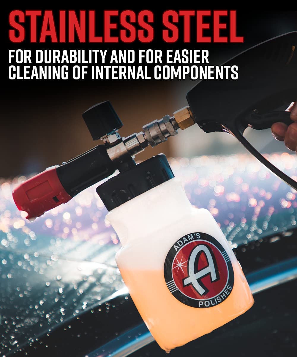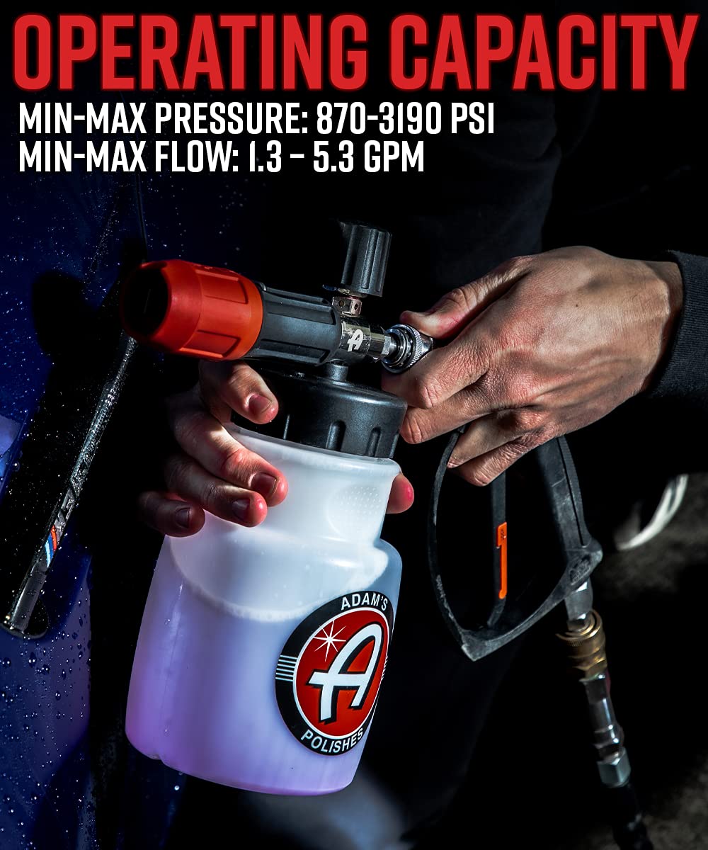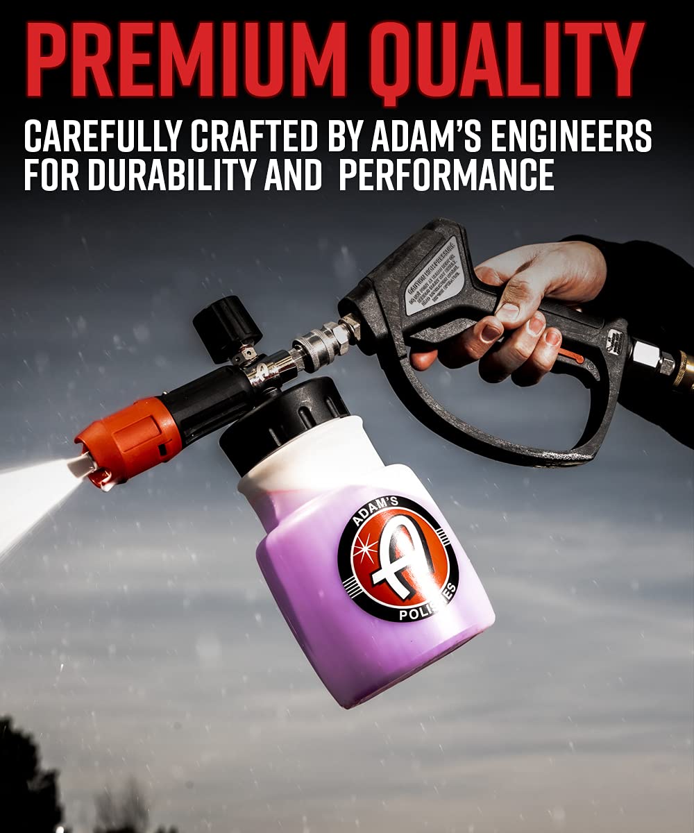 ? MASTER YOUR DETAILING GAME with a pressure wash foam cannon that's packed with industry-leading features. Our Foam Lance comes with dual adjustable spray fans, brass and stainless steel fittings, and a foaming nozzle that fits all types of bottles. | ? A MUST-HAVE FOR ANY DETAILING ENTHUSIAST, the Foam Lance can speed up your cleaning routine while reducing the risk of damaging delicate surfaces. The layers of foam created by our cannon provide lubrication and protection for your car's paint, wheels, and trim. | ? THE ULTIMATE FOAMING EXPERIENCE - Our Foam Cannon holds over 32oz of liquid, add Adam's Mega Foam to the mix and create a thick layer of foam that blankets your car! OR attach Adam's 16oz bottles directly for maximum convenience. | ? PRESSURE WASHING MADE EASY - With our Foam Cannon, you can make car cleaning a breeze. The pressurized water and soap mixture creates a thick layer of foam that clings to your car's surface, making it easy to remove dirt and grime. Use it for other household tasks like cleaning walkways, windows, and siding too! | ? 110% SATISFACTION GUARANTEED - At Adam's, we're committed to providing the best car cleaning supplies and accessories on the market. If you're not satisfied with our Foam Cannon or any of our other products, let us know and we'll make it right!