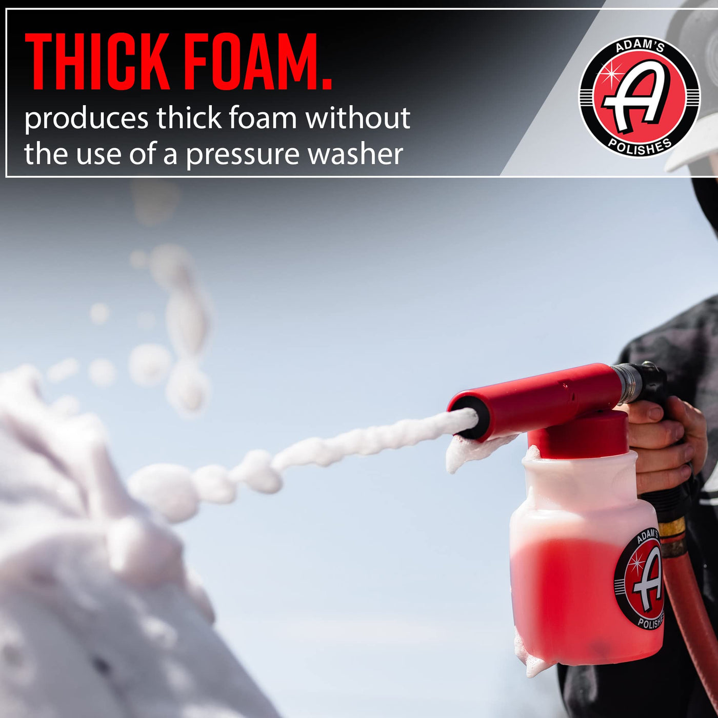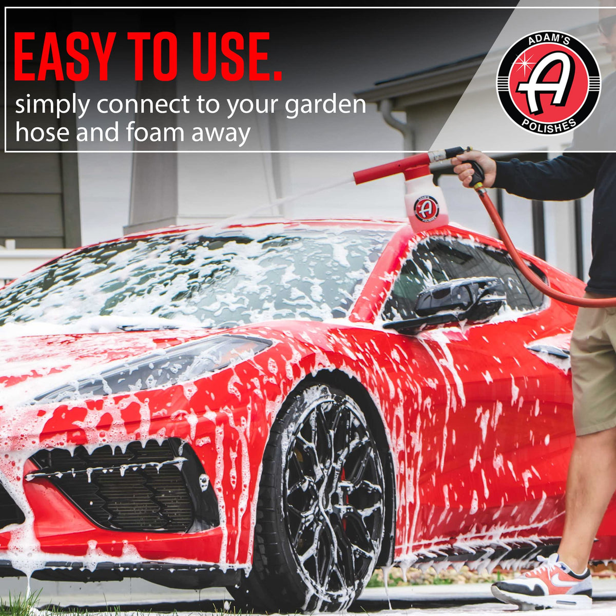 ? NO PRESSURE WASHER NEEDED, & MAKES A GREAT GIFT - Adam’s Premium Foam Gun is very effective and fun way to clean your car. With every wash, Adam’s Foam Gun gives you a copious amount of car wash soap foam and attaches to your standard garden hose. It’s not as foamy as Adam’s Foam Cannon but its cleaning power is still very impressive! | ? INCREDIBLE AMOUNT OF SUDS - This unique design offers a quick connect hose nozzle to let you get back to rinsing your wheels, tires, & other exterior components quickly and easily! Adam’s Premium Foam Gun produces rich wash foam for increased lubricity to avoid any unwanted scratches during your car wash. Works well with any car wash soap or car detailing supplies like a wash sponge, mitt, pad, and more. | ? PREMIUM, HEAVY DUTY CONSTRUCTION - Adam’s Foam Gun makes the perfect gift and becomes a weekly ritual that the entire family can enjoy! Featuring a full custom design, stainless steel fittings and dual thread lid, simply add your water first, then 3-5 ounces of your favorite car shampoo to thoroughly mix through the 35-ounce canister! If you are using Adam’s Mega Foam, we recommend 2-3 ounces. | ? WIDE FAN SPRAYER FOR MAXIMUM COVERAGE - When setting up your car wash foam gun, you’ll have the option of 1 metering tip with 4 dilution ratios to control just how much soap you want to run through (we recommend the MOST). The wide coverage will cut down your wash time significantly and allow you to focus on the more tedious aspects of washing and letting the larger chunks become a breeze! | ? 110% SATISFACTION GUARANTEE & USA MADE - At Adam’s, we strive to bring the BEST car cleaning supplies, car cleaning kit, washing accessories, microfiber cleaning cloth or towels, waxes, sealants, ceramic coatings, mops, brushes, mitts, sponges, garage tools, applicators & other high-quality car cleaning products to the car care industry. If you are not satisfied, let us know & we’ll do everything we can to make it right!