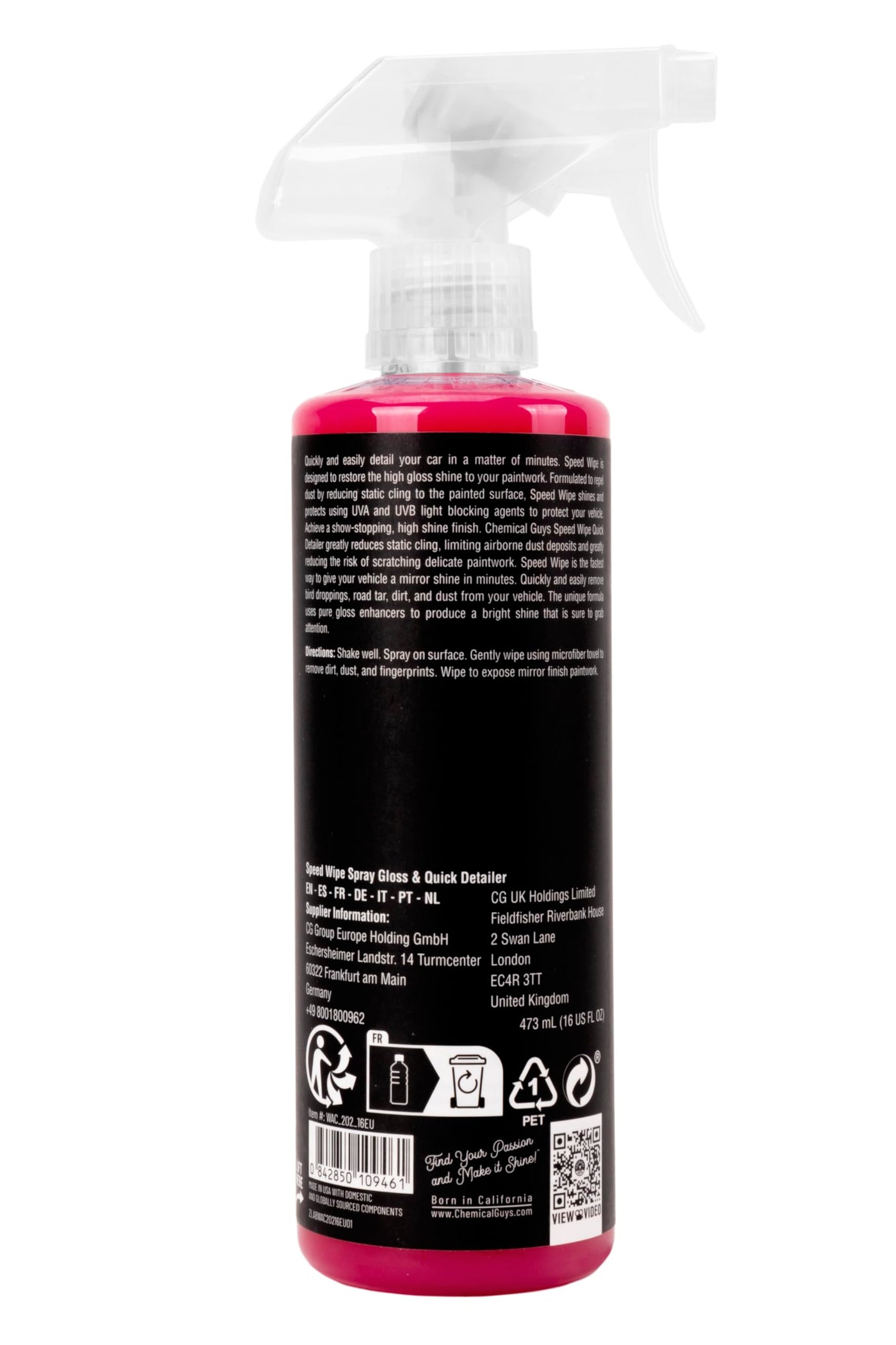Speed Wipe Quick Detailer & High Shine Spray Gloss is an enhancing quick detail spray designed to deliver a static-free mirror shine in minutes. Speed Wipe is 100 percent wax free, formulated with pure gloss enhancers to deliver a perfect finish. Speed Wipe is engineered to repel dust by reducing static cling by up to 75 percent . Speed wipe cleans, shines, and protects using advanced solar blocking technology. Quickly and easily remove dirt, dust, fingerprints, and smudges in seconds. Formulated using all new gloss enhancing polymers, Speed Wipe creates an impressive show winning shine. The streak-free formula works on clear coat and single stage paintwork for a bright shine on any car. The versatile formula also works great on chrome, polished aluminum, stainless steel, and glass surfaces. Speed Wipe leaves your paint with a thin protective layer that bonds with waxes and sealants to give a slick, high gloss shine. The versatile detail spray performs excellent on metal, chrome, stainless steel and even glass. The innovative formula even allows Speed Wipe to be used in direct sunlight.
