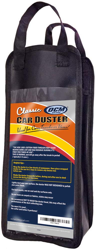 This OCM Brand Classic Exterior Car Duster with a cover offers exceptional quality and performance at a value price.The long and narrow duster mop head ( 3" wide X 13" long ) and a long solid wood handle ( 22" combined length ) is ideal for reaching into tight spaces on your vehicle. We recommend that you DO NOT WASH THE DUSTER HEAD. The Duster features a specially formulated wax that is infused into it's 100% soft cotton fiber threads. This enables the duster to gently lift and remove dust. OCM uses the softest threads to protect your paint from scratches. Because the threads are 100% cotton, the new duster may leave some lint and wax residue during it's first few times of initial use. This is normal and will go away once it is broken-in. The more it is used the softer and better it gets. Frequently shake the duster before, during and after use. The duster will gradually turn black, but will continue to pick up dust for years of trouble free service. 100% MANUFACTURER MONEY BACK GUARANTEE - If your ever unsatisfied with the product the Manufacturer will refund your order. No Questions Asked! OCM is an American Company with US Based Customer Support!