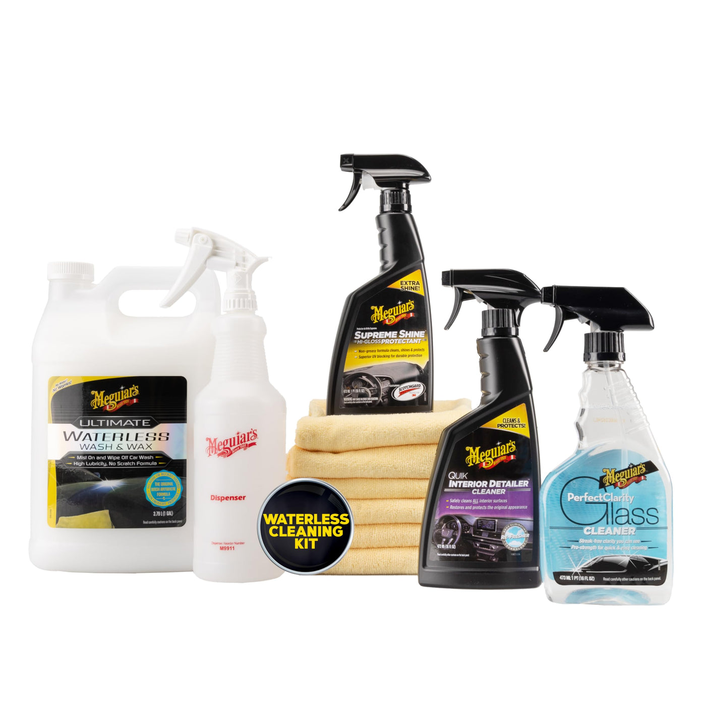 Q: What is included in Meguiar's G3626 Ultimate Waterless Wash & Wax kit?A: The kit includes 11 essential detailing products designed for cleaning and protecting your car without water. This all-in-one kit features Ultimate Waterless Wash & Wax, Quik Interior Detailer, Supreme Shine Protectant, Perfect Clarity Glass Cleaner, and 6 premium reusable microfiber towels.